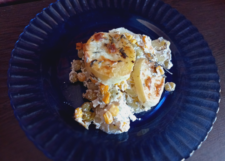 Картофена запеканка с грах, царевица, сирене и сметана