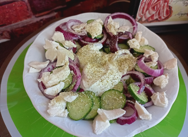 Краставици, червен лук, заквасена сметана, моцарела и сух копър