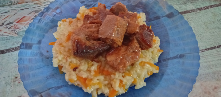 Варен ориз с моркови и печено свински с готови сосове