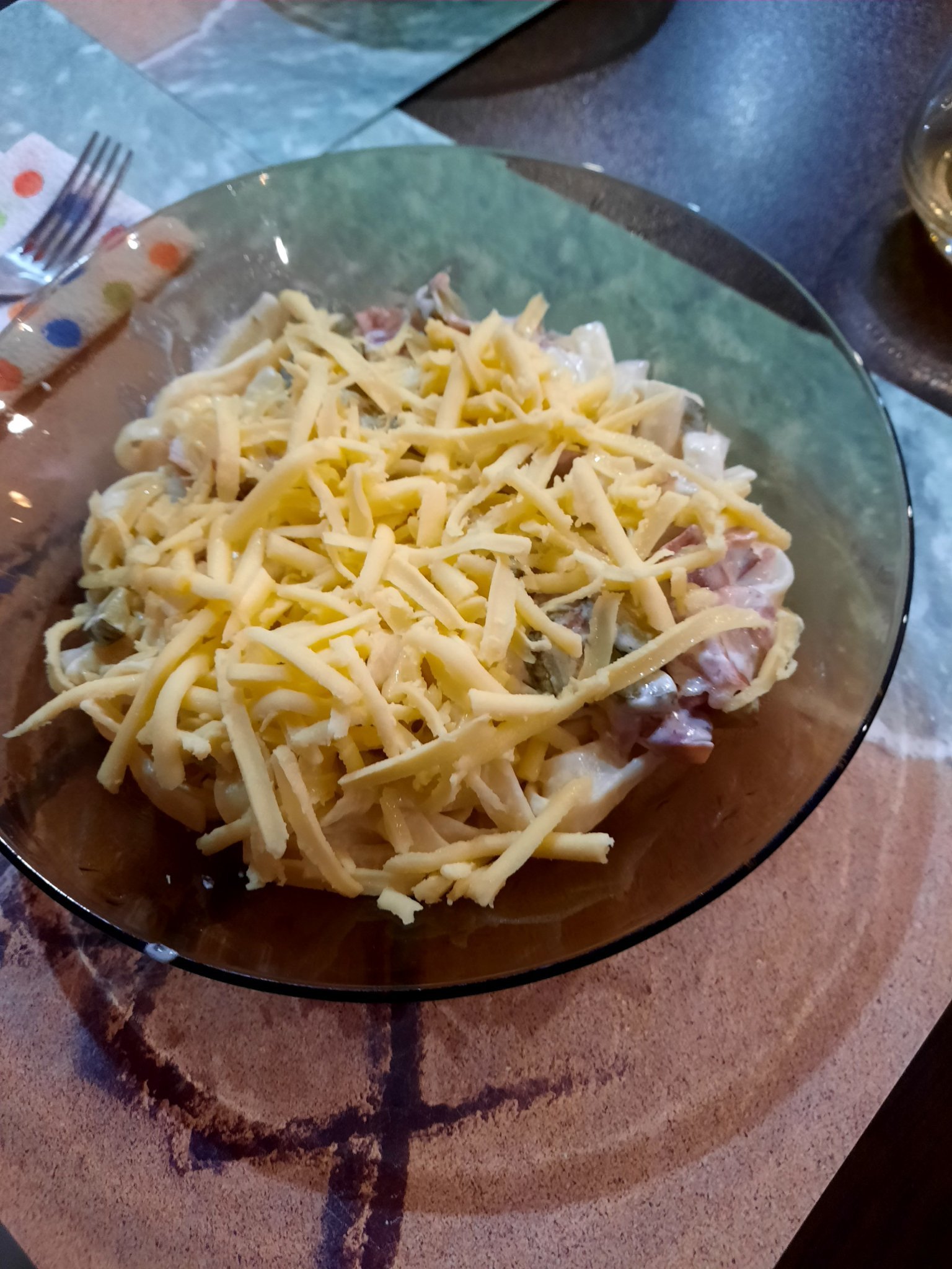Талиатели с кисели краставички, прошуто, сметана, топено сирене и кашкавал