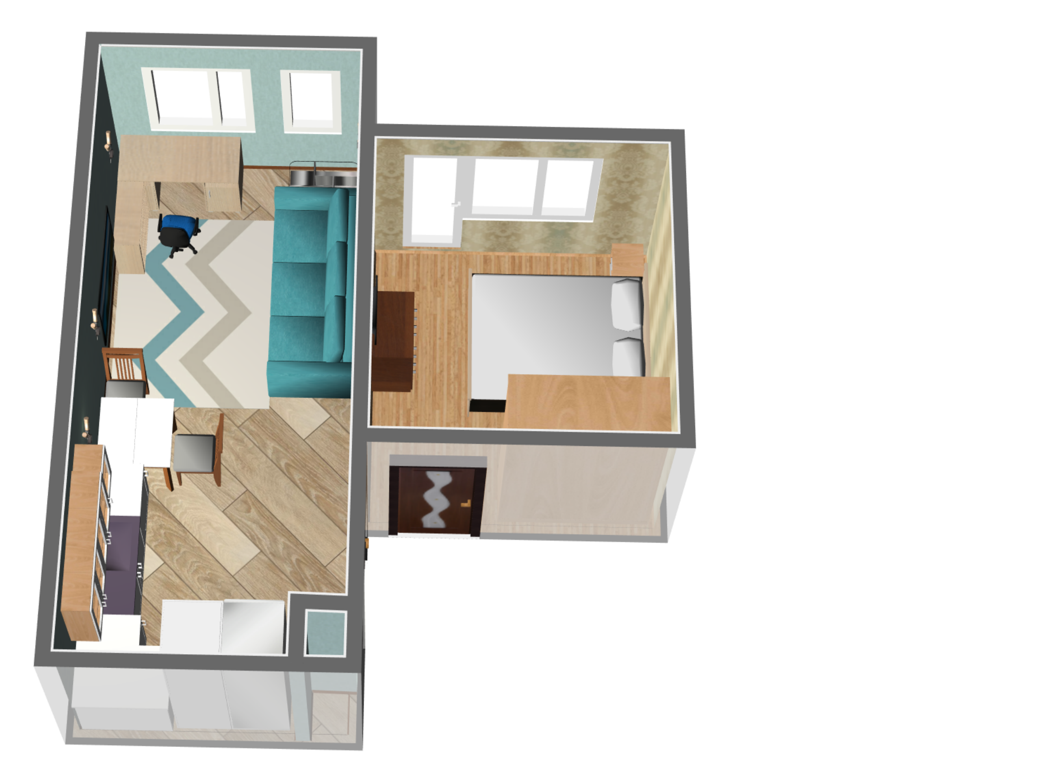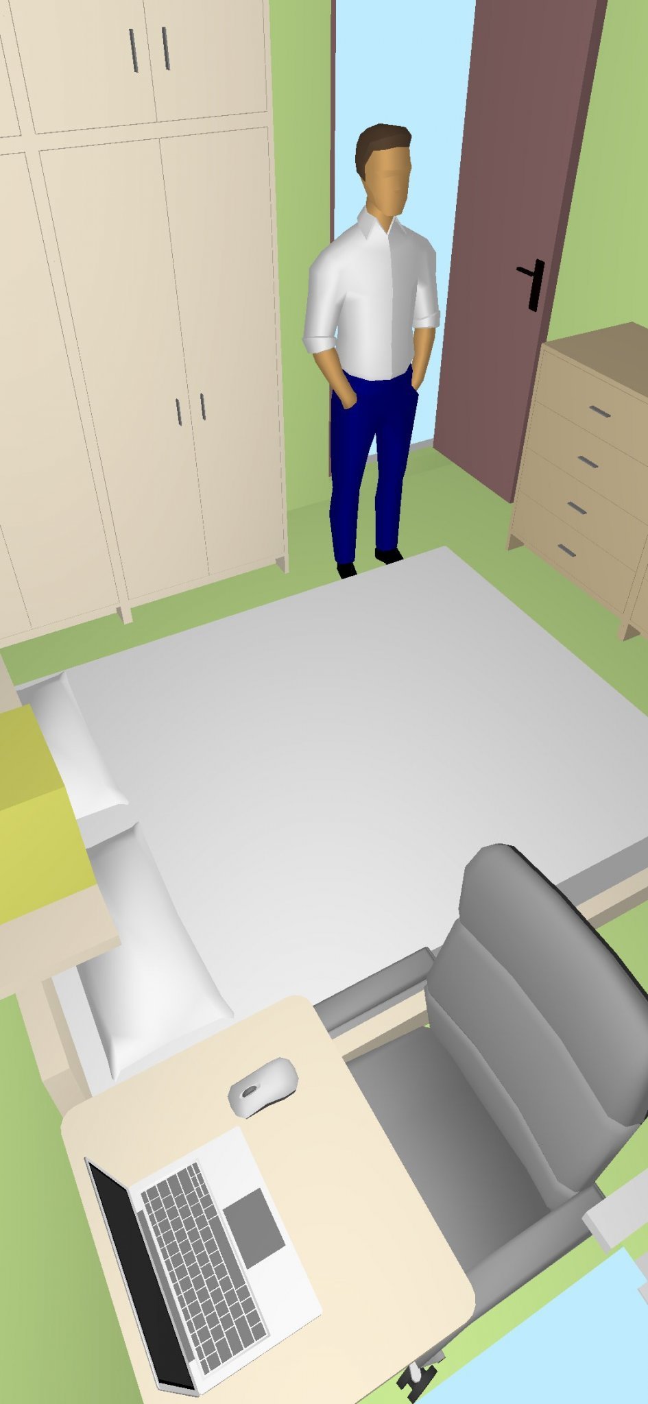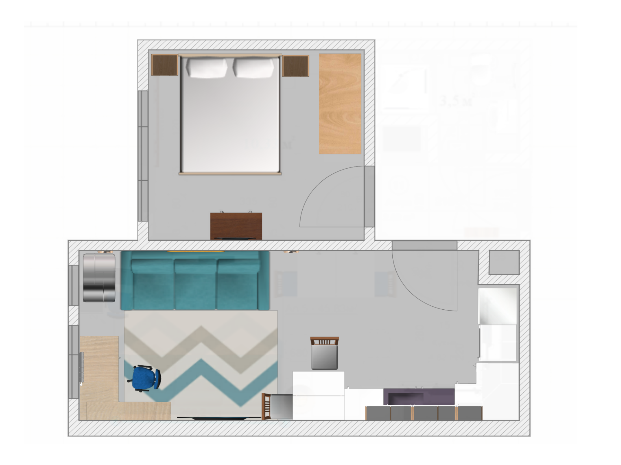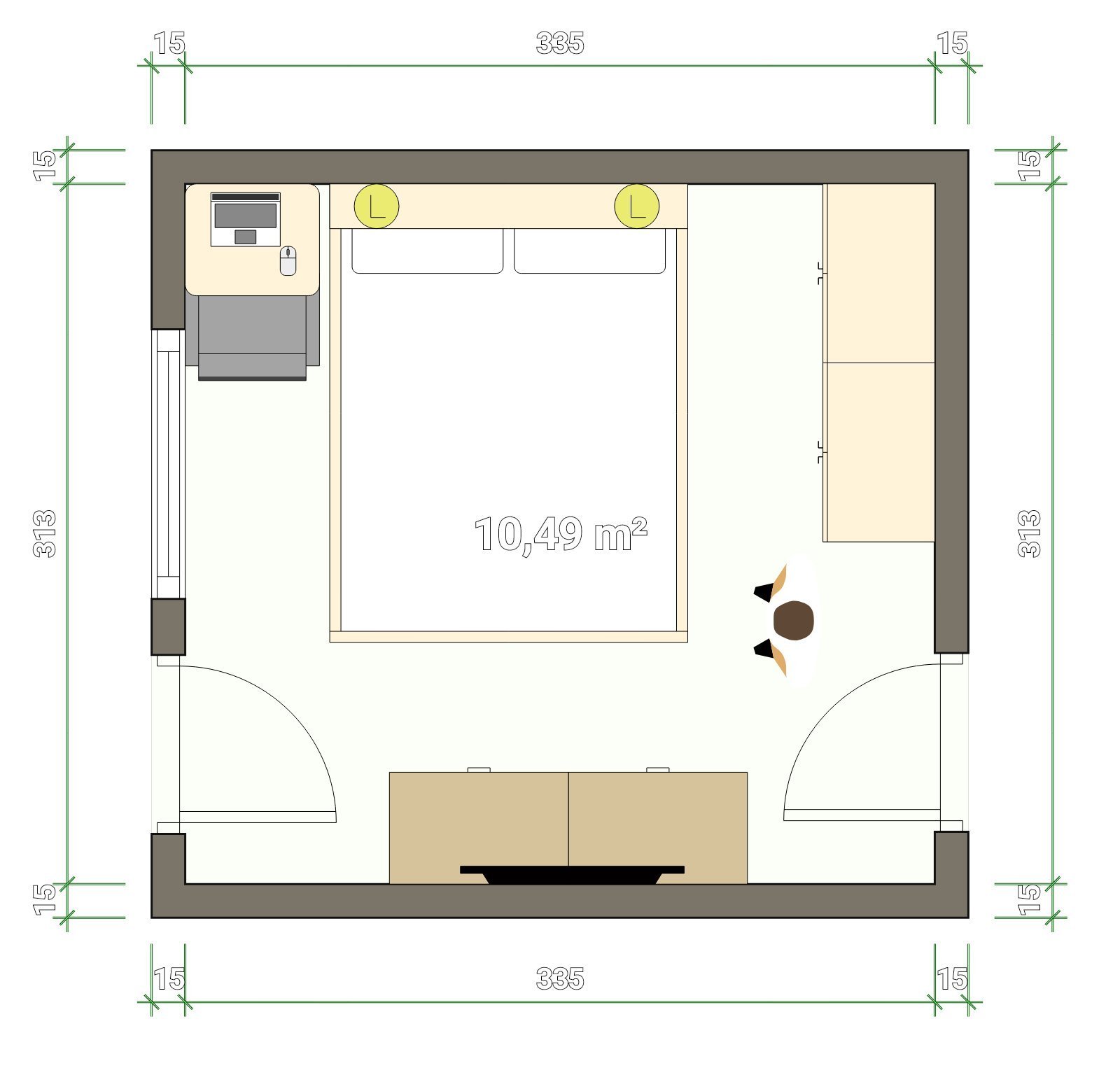 Може да се сложи бюро срещу леглото между балконската врата и вратата на стаята. Може също и малко бюрце между леглото и прозореца вместо нощно шкафче.