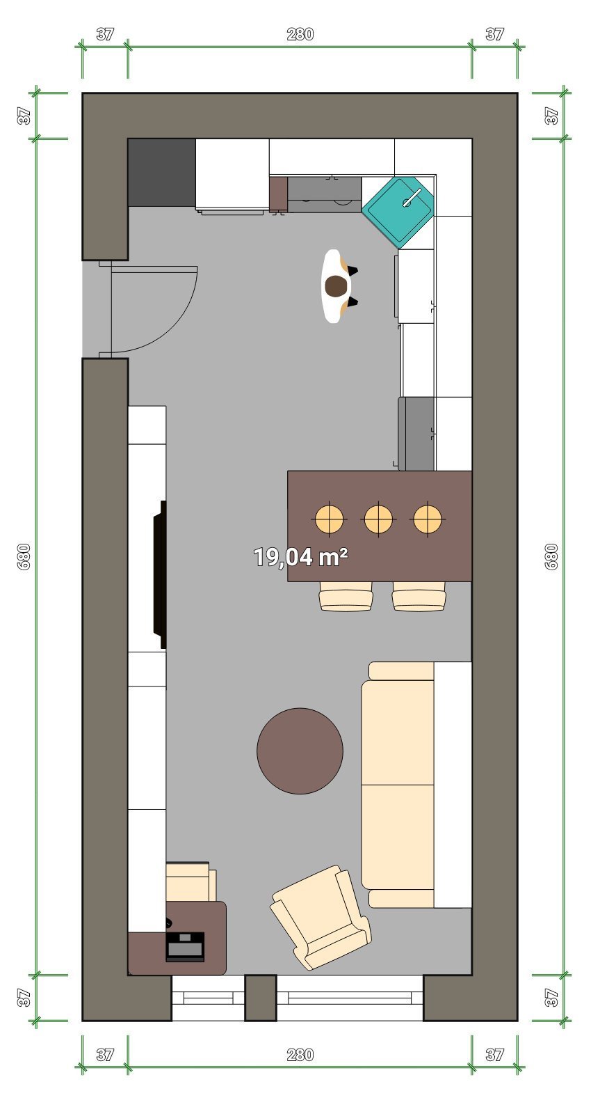То не е баш остров, ами П-образен кухненски бокс. Като гледам колко е висок таванът, тръбите на мивката вероятно минават в стената/острова, а не в пода. Ако го лепнеш така за стената, ще има доста пространство за работа и още място за съхранение. Но наистина не знам ако ти е 2.80 ширината на кухнята как ще стане П-образно. Плотовете за работа към стената са дълбоки 60 см, още метър за вратата на съдомиялната - дотук остава свободно пространство 1.20. От него махни минимум 90см за вратата, че да не се блъска в острова, и островът ти трябва да е макс 30 см дълбок - това е един лист А4... ок, да кажем, че плотовете към стената станат 50 см - островът ще стане 40, никаква практическа разлика в него, а плотовете се смаляват нефункционално. Както и да го развъртиш, ще местиш едни 10-15 см от едната страна в другата, ако въобще стигат.