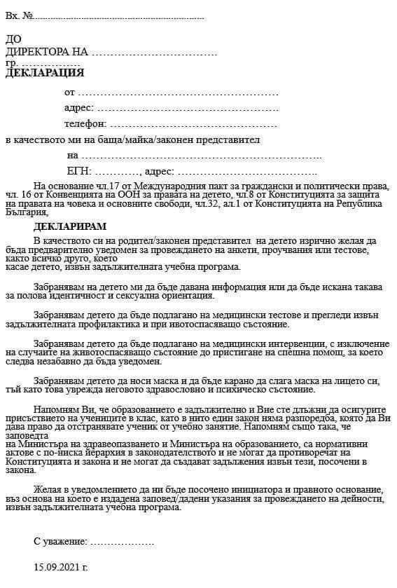 Някои родители стигат до декларация против мерките в училище. Майка коментира, че подала подписана от нея същата декларация до директора на училището, в което започнал да учи сина й и имало ефект от това.  Явно някои намират вратички в заповедите. И какво излиза че мерките са само на хартия, както се и очакваше. Някои не могат да свикнат, че мерките не са пожелателни и важат за всички.