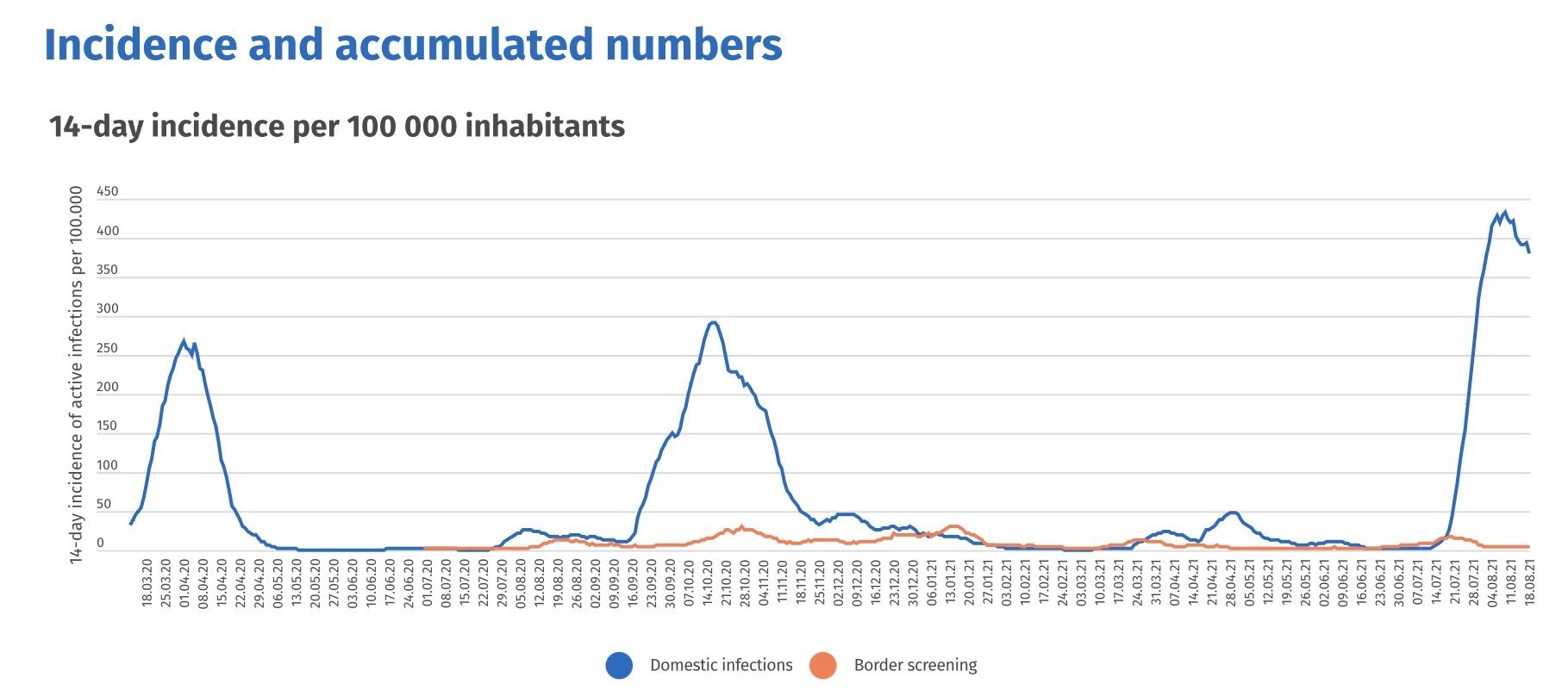 Ваксините бяха и причината да се наложат доста по-слаби ограничения за овладяване на положението. В общи линии: дистанция от 1 м; маски там където не може да се спазва (за 16+); общ бан за събиране на едно място на не повче от 200 души; затваряне на заведенията в 00:00 часа. Гимназиите (16г+) започнаха учебни занятия тази седмица. Горните общи препоръки  и правила важат и за тях. За учениците препоръките са че може и да не носят маски в часовете, но гимназиите могат да ги изискват ако решат. Основните училища (до 16г)  започват следващата седмица. Маски там децата няма да носят. Следващата седмица започава и масовта ваксинация на 12-15 годишните.