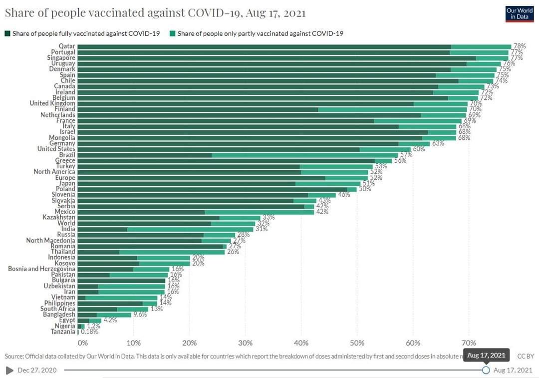Май не тиранията, а простотията ни е проблем. Ето ви една снимка къде сме във ваксинациите - между Пакистан и Узбекистан. Все пак Танзания и Нигерия са след нас.  Класацията е направена по първа доза, но при нас, понеже няма желаещи, двете графики почти напълно съвпадат.