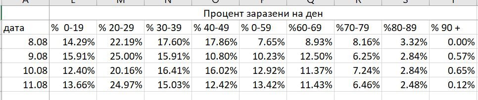 1. Процент заразени за дадена възрастова група спрямо общите случаи за деня: