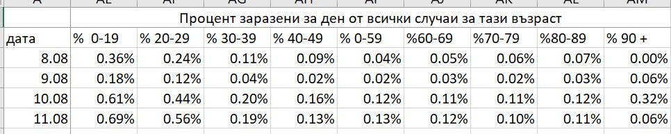 2. Процент заразени за дадена възрастова група на ден спрямо общия процент заразени в същата възрастова група. Според мене е по-информативна статистика, защото показва различния тренд спрямо предишните вълни.
