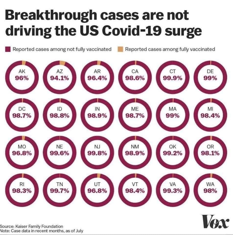 Ето още една картинка за някои от щатите - данните са събирани от Кайзър - най-голямата болнична И застрахователна система в САЩ. Вече не знам, кое не му е разбираемото на факта, че ваксинирани се заразяват по-рядко, болни са за по-кратко време, т.е. заразяват по-малко хора и по-често не стигат до болница.