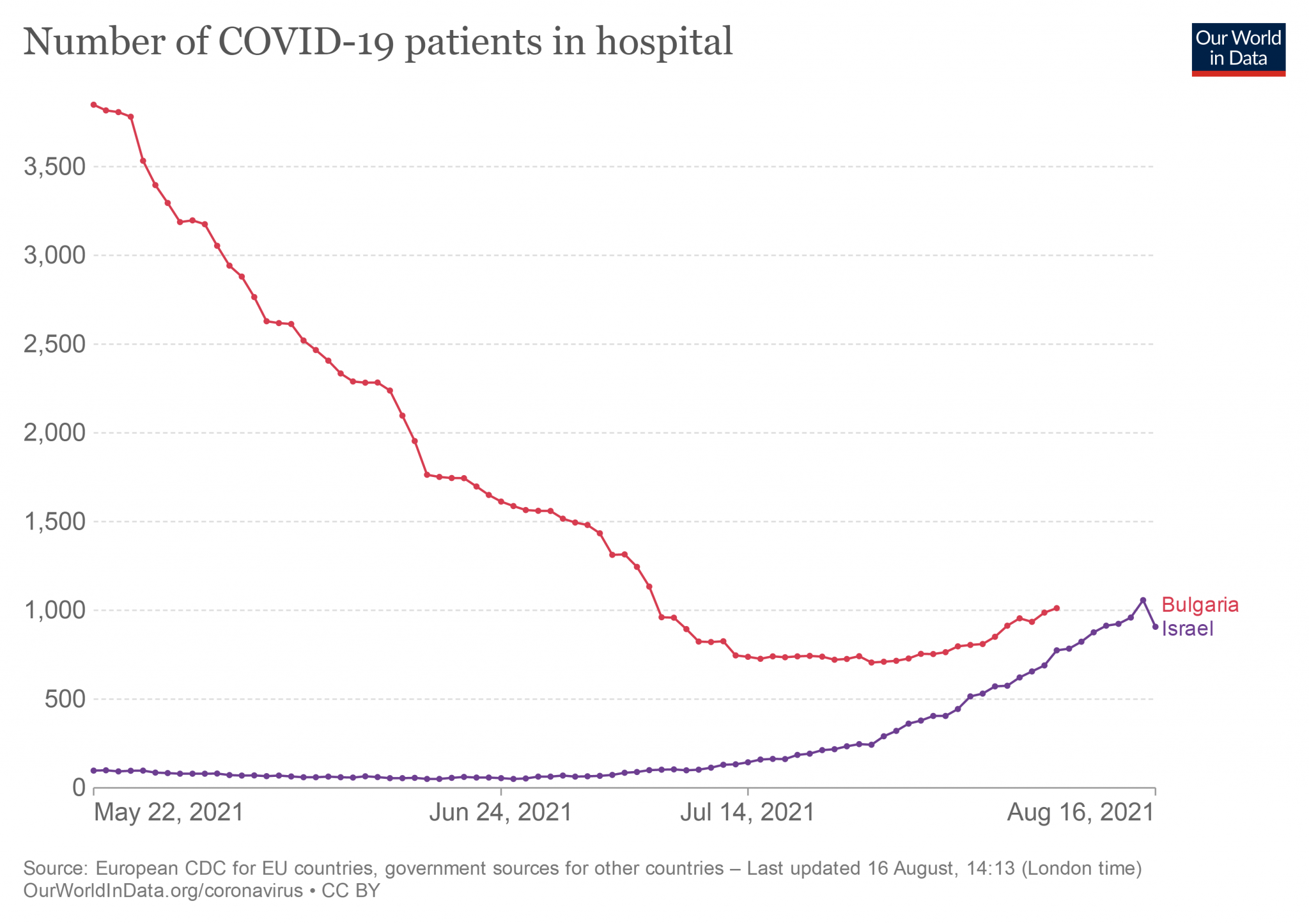 Сутринта го гледах набързо и не съм обърнал внимание, че цифрите в таблицата за броя хоспитализирани по възраст и степен на ваксиниране  са дадени по дифолт като брой на 100 000 население от съответната група (например за зрастова група от 40 до 49 години има 789 хоспитализирани на 100 хиляди неваксинирани, 253 хоспитализирани на 100 хиляди с една ваксина, и 589 на 100 хиляди напълно ваксинирани). Ако се превключи на реални бройки, в момента за същата възрастова група в болница са 1147 неваксинирани пациента, 66 с една ваксина, и 5465 напълно ваксинирани!