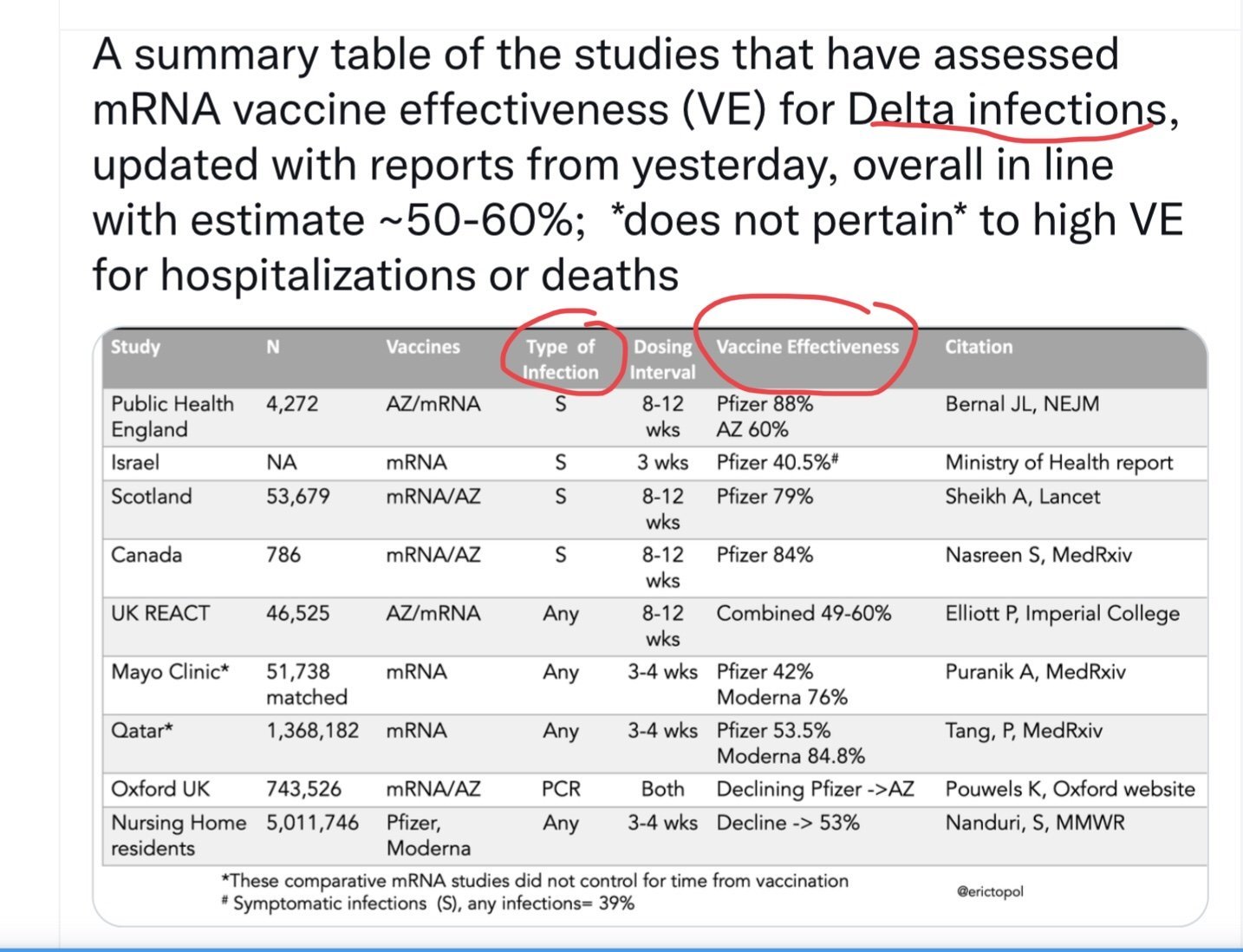 Та според последния репорт, за предишните 3 седмици е имало общо 105 793 нови случая с делта. От тях за 10 000 няма данни дали са ваксинирани или не, 36583 са при неваксинирани, и 59210 са били сред ваксинирани в с една или две дози (40451 са при напълно ваксинирани). Около 60% от населението е ваксинирано в с една или две дози, т.е. от тези данни излиза, че за делта варианта ваксините не предпазват от заразяване.