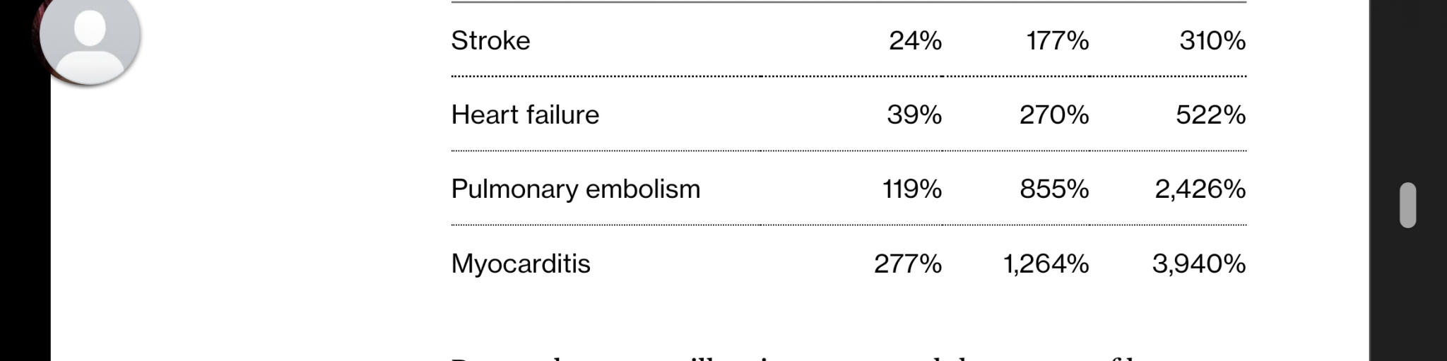 Те открили, че нехоспитализираните пациенти с Covid имат 39% повишен риск от развитие на сърдечна недостатъчност и 2,2 пъти повишен риск от потенциално смъртоносен кръвен съсирек, известен като белодробна емболия, през следващата година, в сравнение с някой, който не е развил заболяване.  Това води до допълнителни 5,8 случая на сърдечна недостатъчност и 2,8 случая на белодробна емболия на всеки 1000 пациенти с Covid, които никога не са били хоспитализирани.