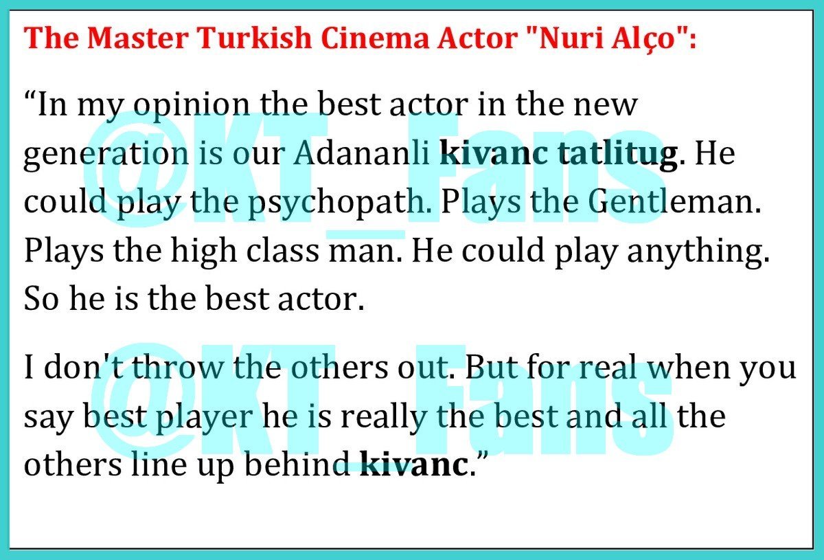 "По мое мнение най-добрия актьор от новото поколение е нашето момче от Адана-Къванч Татлъту. Той може да играе психопат. Играе джентълмен, играе мъж от висока класа, той може да изиграе всичко.