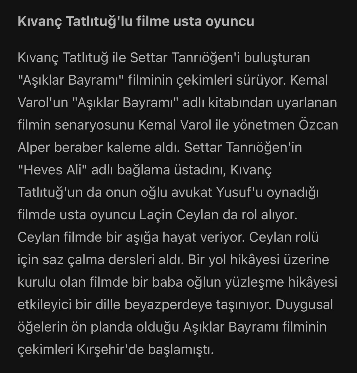 Красивият актьор Къванч Татлъту, който снима за интернет платформата NETFLIX, отслабна с 10 кг за ролята си във филма „Празникът на влюбените“. Нови снимки на Къванч Татлъту в социалните мрежи не оставиха феновете му безразлични и за кратко време спечелиха голям брой харесвания и ентусиазирани коментари. Актьорът сподели новата си външност, която придоби специално за снимките във филма, базиран на бестселъра на Кемал Варол „Денят на влюбените“, публикацията му „Добро утро“ получи повече от 500 хиляди харесвания и почти 10 хиляди положителни коментара. Името на героя, който ще бъде въплътен на екрана от известния актьор, е Юсуф. Ясемин Ален ще играе бившата любима на героя, снимките с нея се провеждат в Карс.