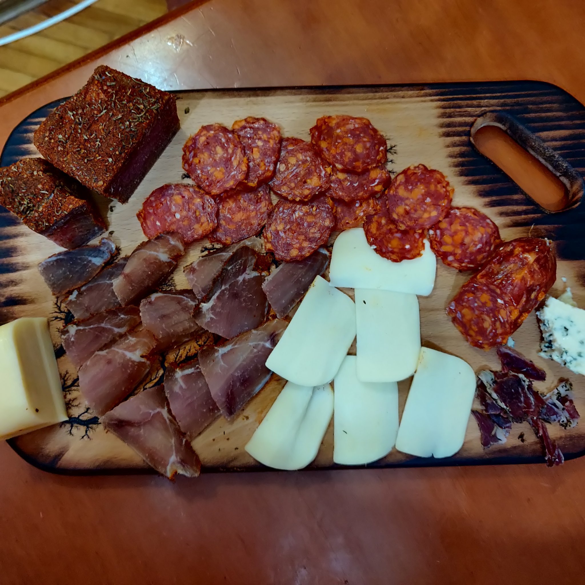 Тук в Рз имахме панаир на киселото мляко, с дребната купихме подарък за ММ - красива дървена дъска...та вечерта я щракнахме напълнена - луканков лют колбас (от панаира, имаше щанд с производители в десния ъгъл-биволска пастърма...но понеже беше въз сурова, малко само за проба), домашна пастърма и турски кашкавал