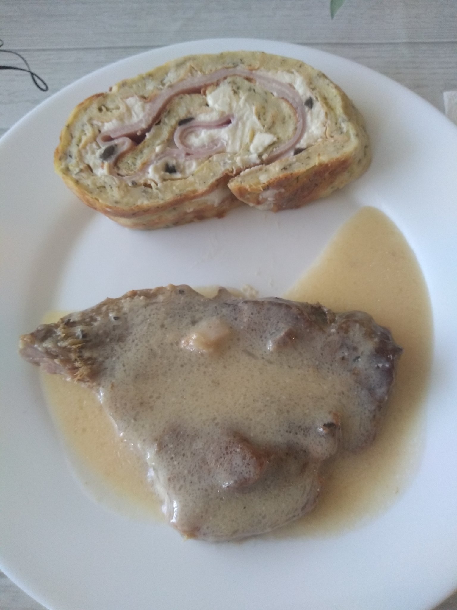 Вратна пържолка, сос топено сирене и руло от тиквички.