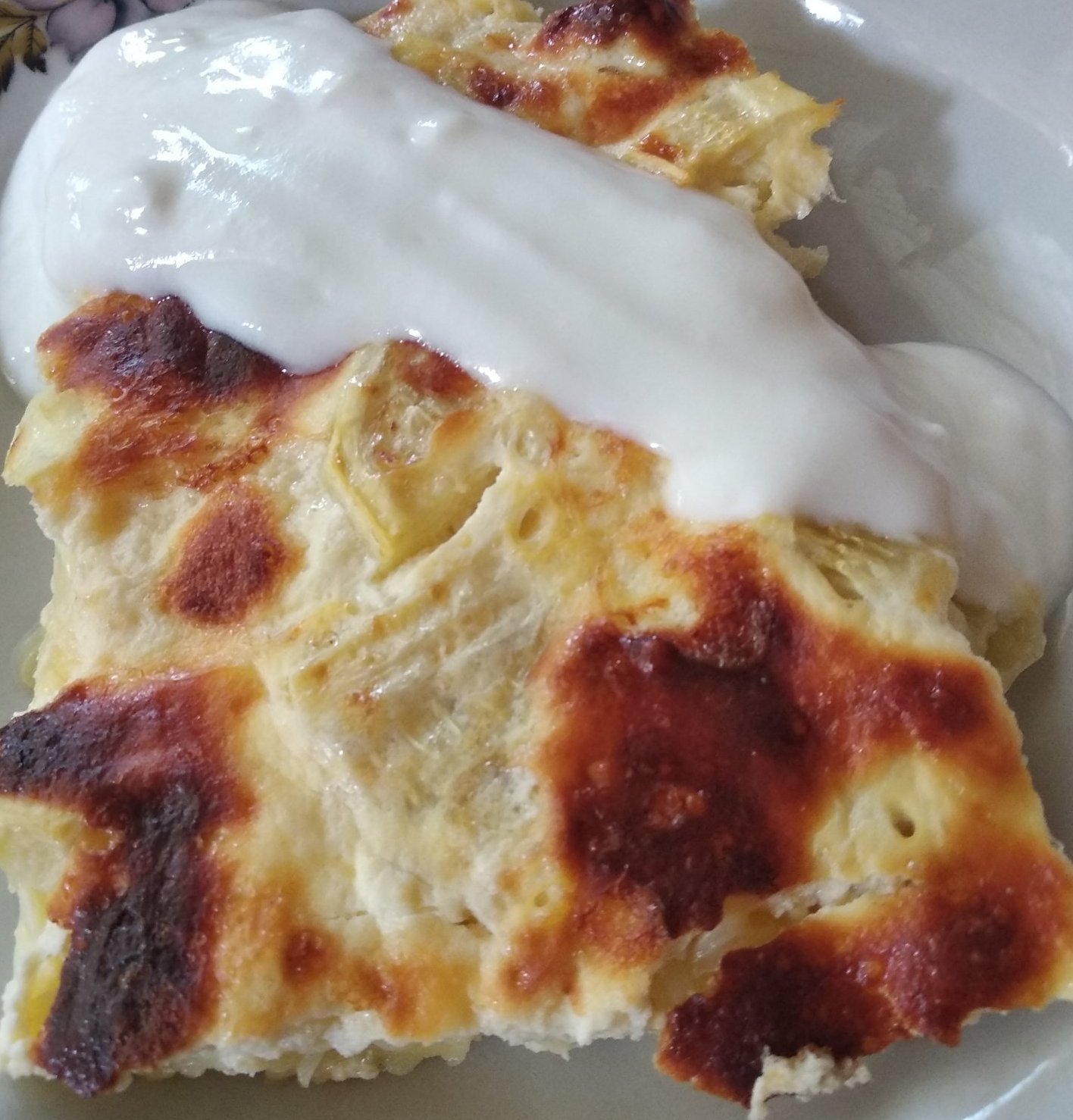 запеканка с тиквички и сирене, гарнирана с чеснов сос