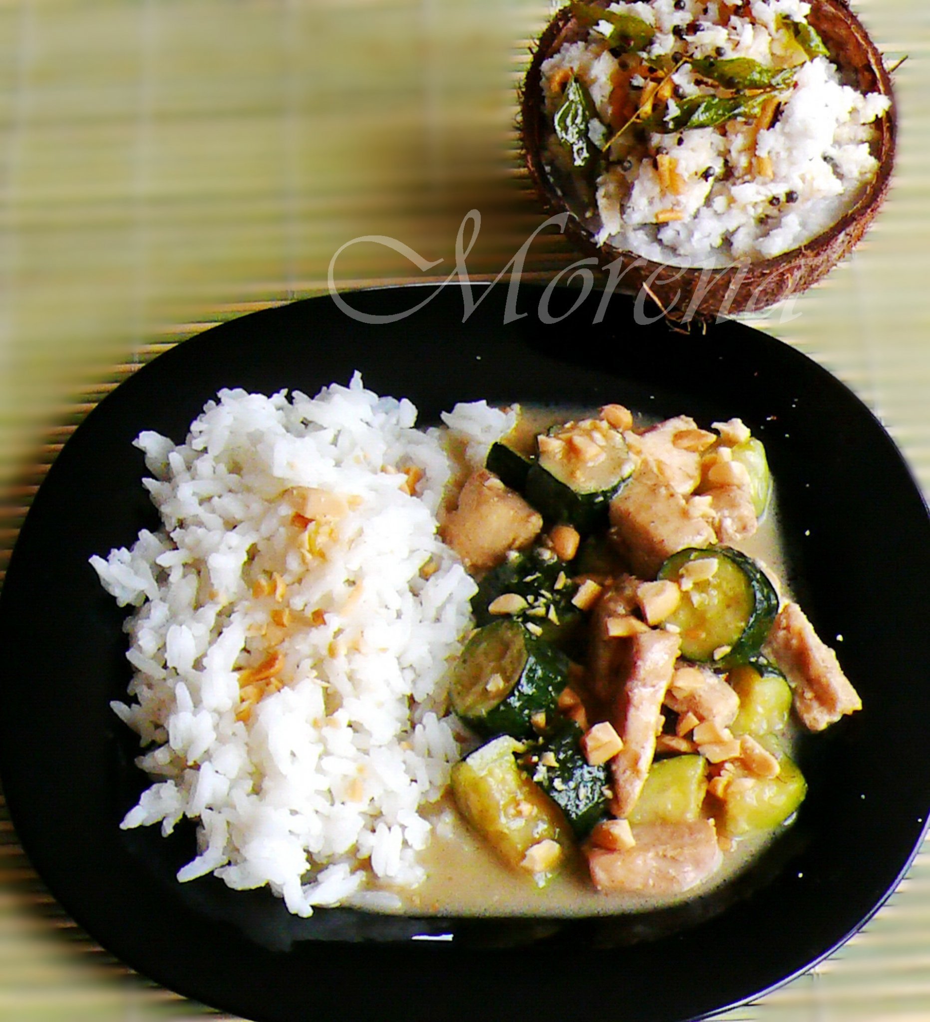 Тайландско зелено къри с пилешко и бейби зелени тиквички,   жасминов ориз  и кокосово чътни