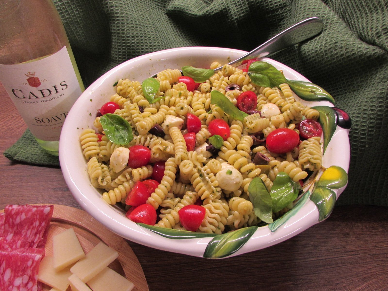 Салата с паста, песто, чери и моцарела + любимото ми Соаве.