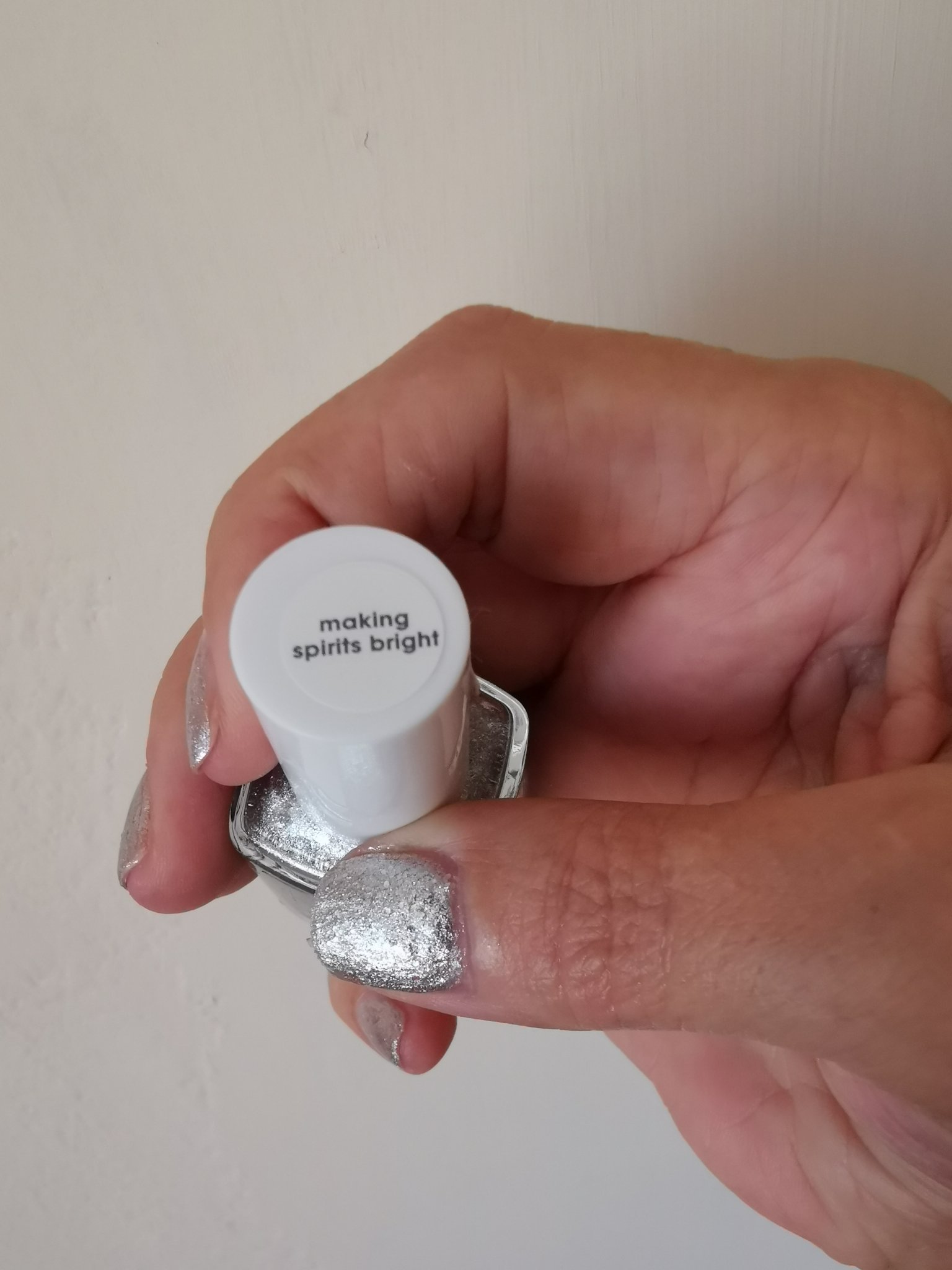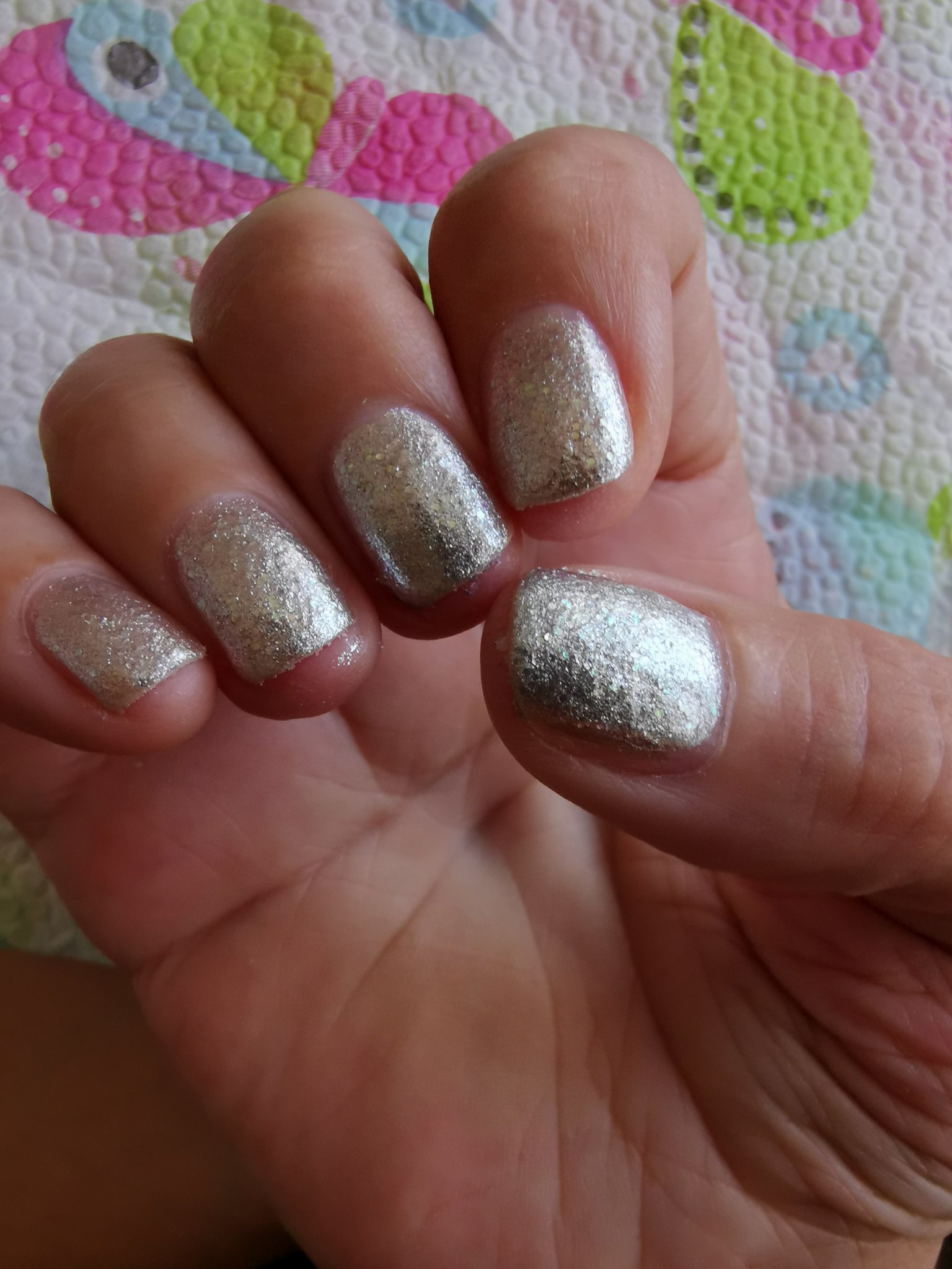 Лепих палците с лепило за нокти, отгоре им сложих и едри холо частички с форма на диамант (малко като ефект счупено стъкло изглежда от разстояние). Доволна съм, частичките постоянно блещукат, а цветът е ужасно летен!