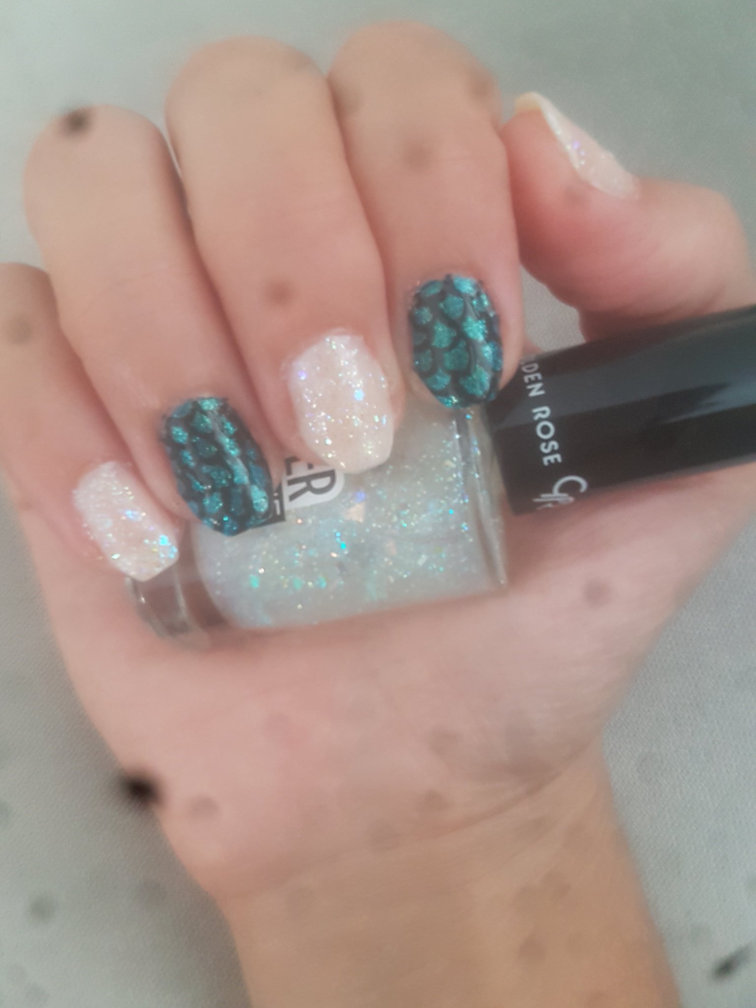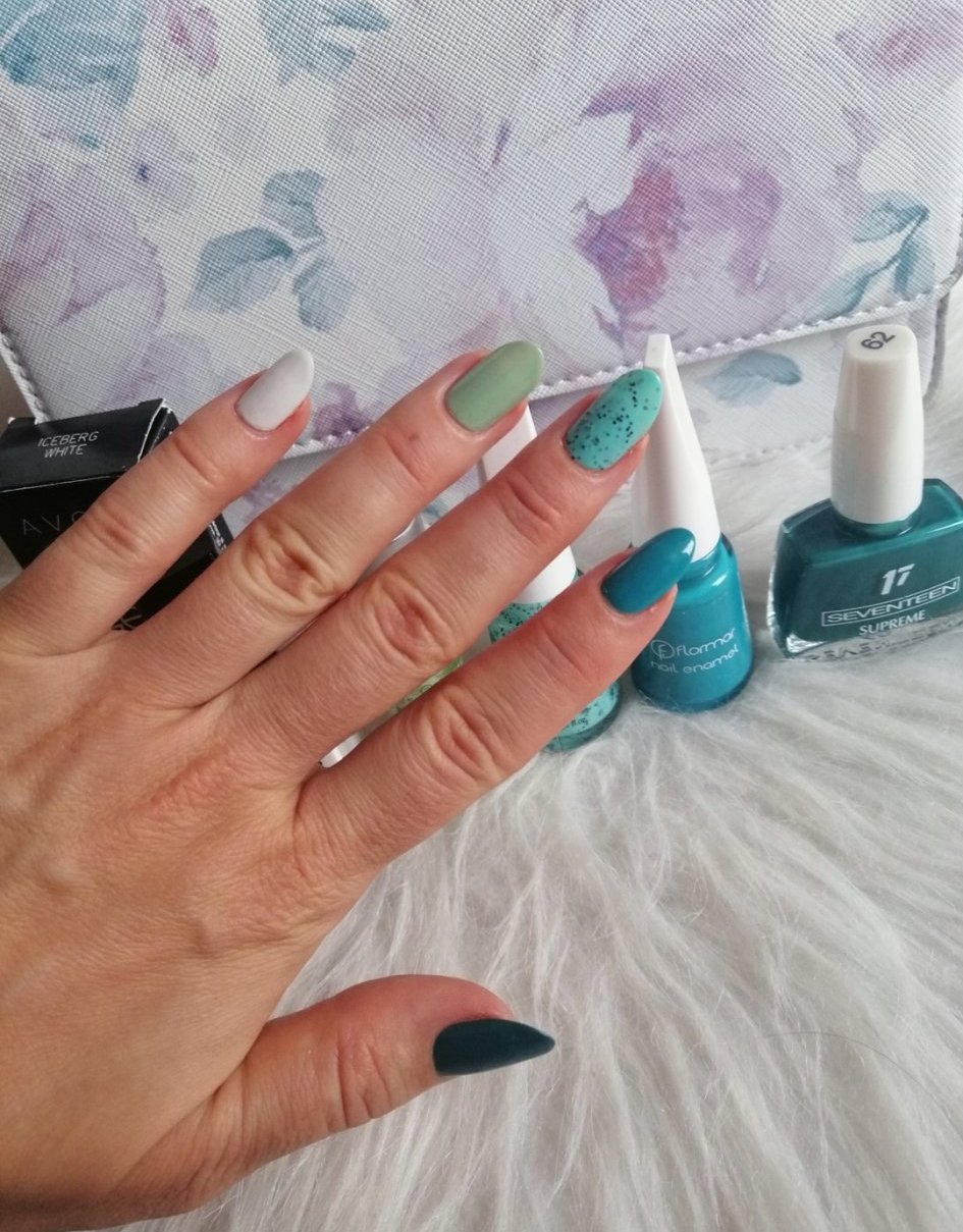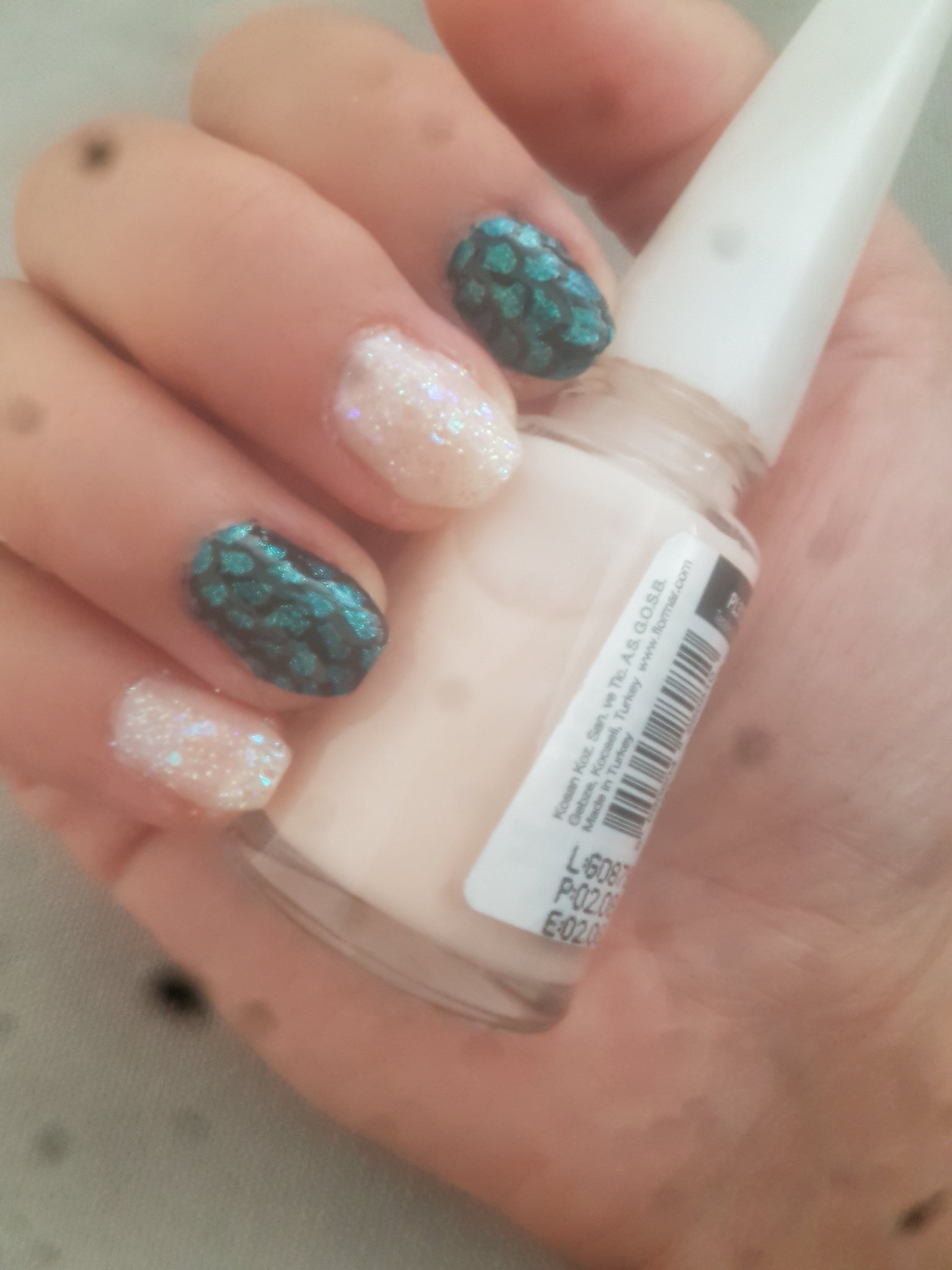 Днес намерих време за лак. Изобщо не можах да го хвана колко е бляскав. Лаковете са flormar pearly pl372 tender beige, GR extreme glitter shine 203, miss sporty precious pearl 050  Turquoise Pearls (много, много любим).
