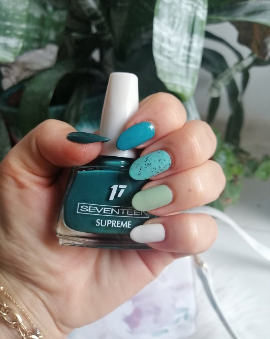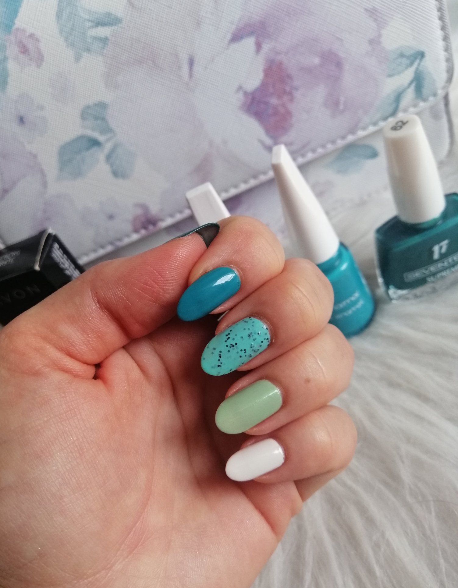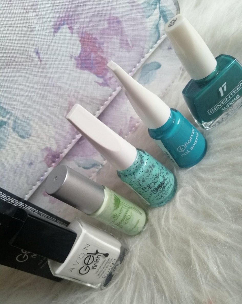 Днес намерих време за лак. Изобщо не можах да го хвана колко е бляскав. Лаковете са flormar pearly pl372 tender beige, GR extreme glitter shine 203, miss sporty precious pearl 050  Turquoise Pearls (много, много любим).