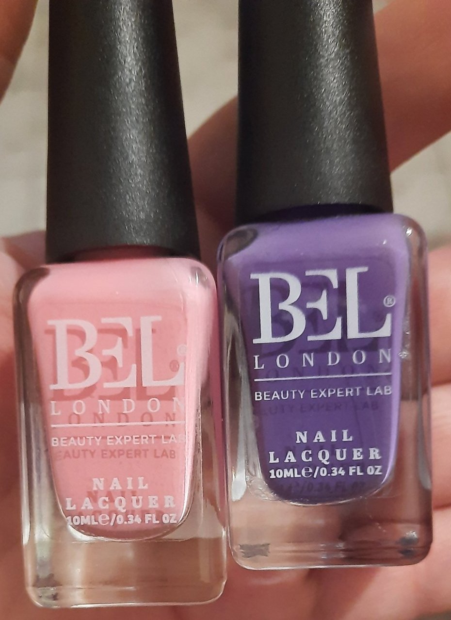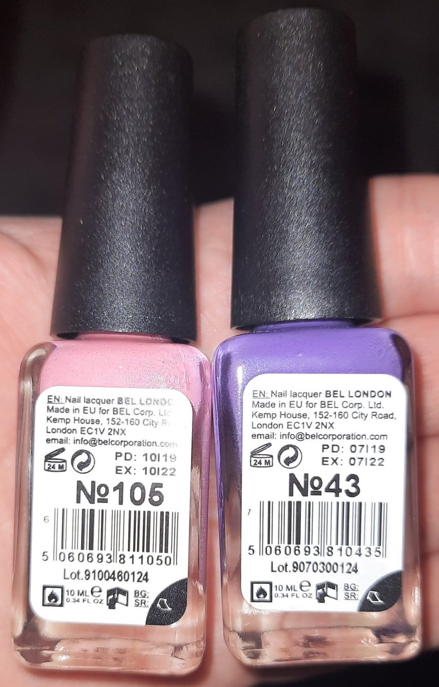 Междудругото, лилавият Бел 43 е с крива четка отдолу, скосена от единия край, а от другия не...Хубаво си мислех аз да отворя внимателно и само да проверя как е четката...ама реших да пропусна (рядко проверявам така четките, предимно на много светли или много тъмни лакове, но помисля ли си го и пропусна ли да го направя- то задължително попадам на кофти четка). 😅 Нищо де, евентуално ще я подстрижа от едната страна, ако пречи на нормалното лакиране...