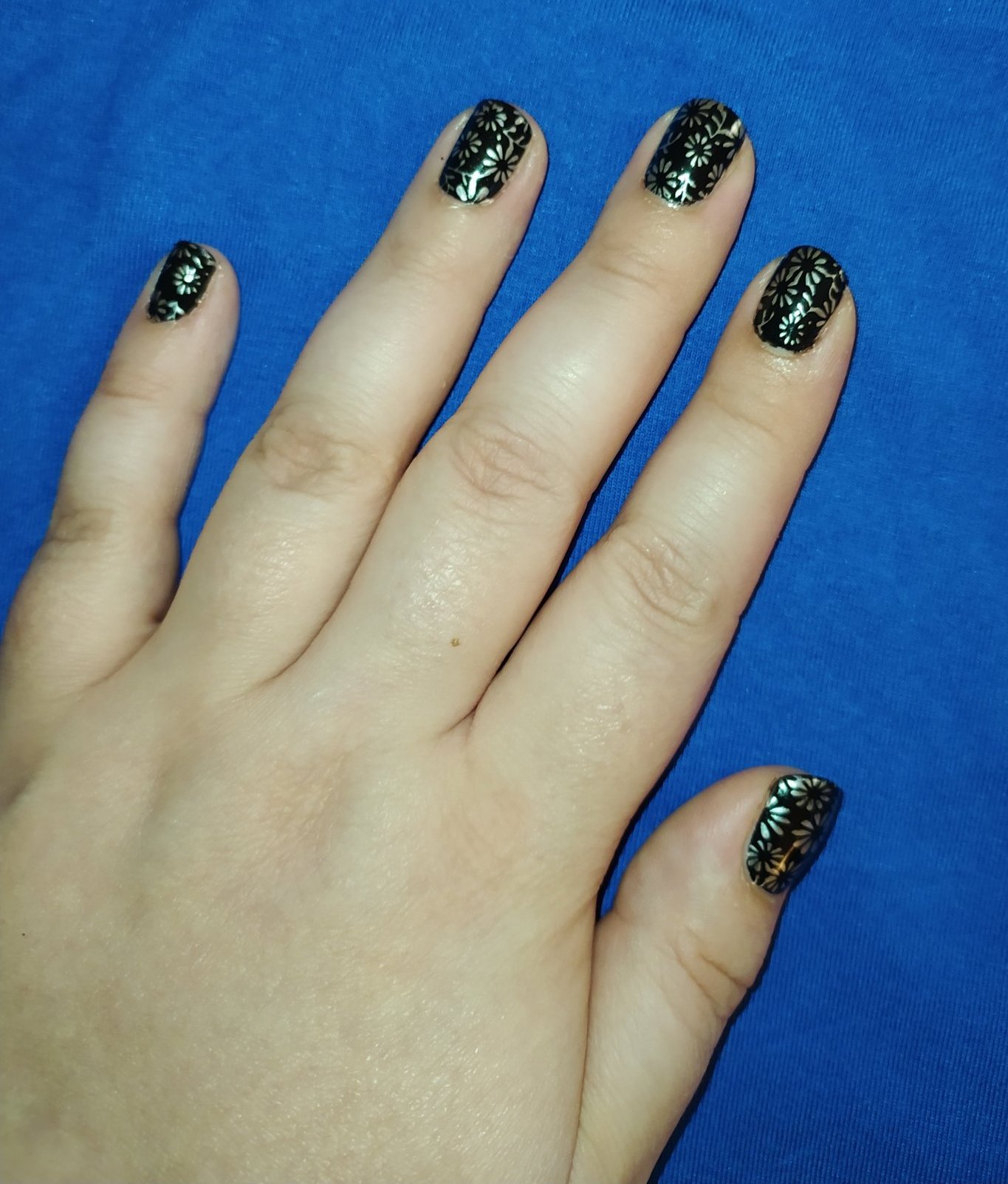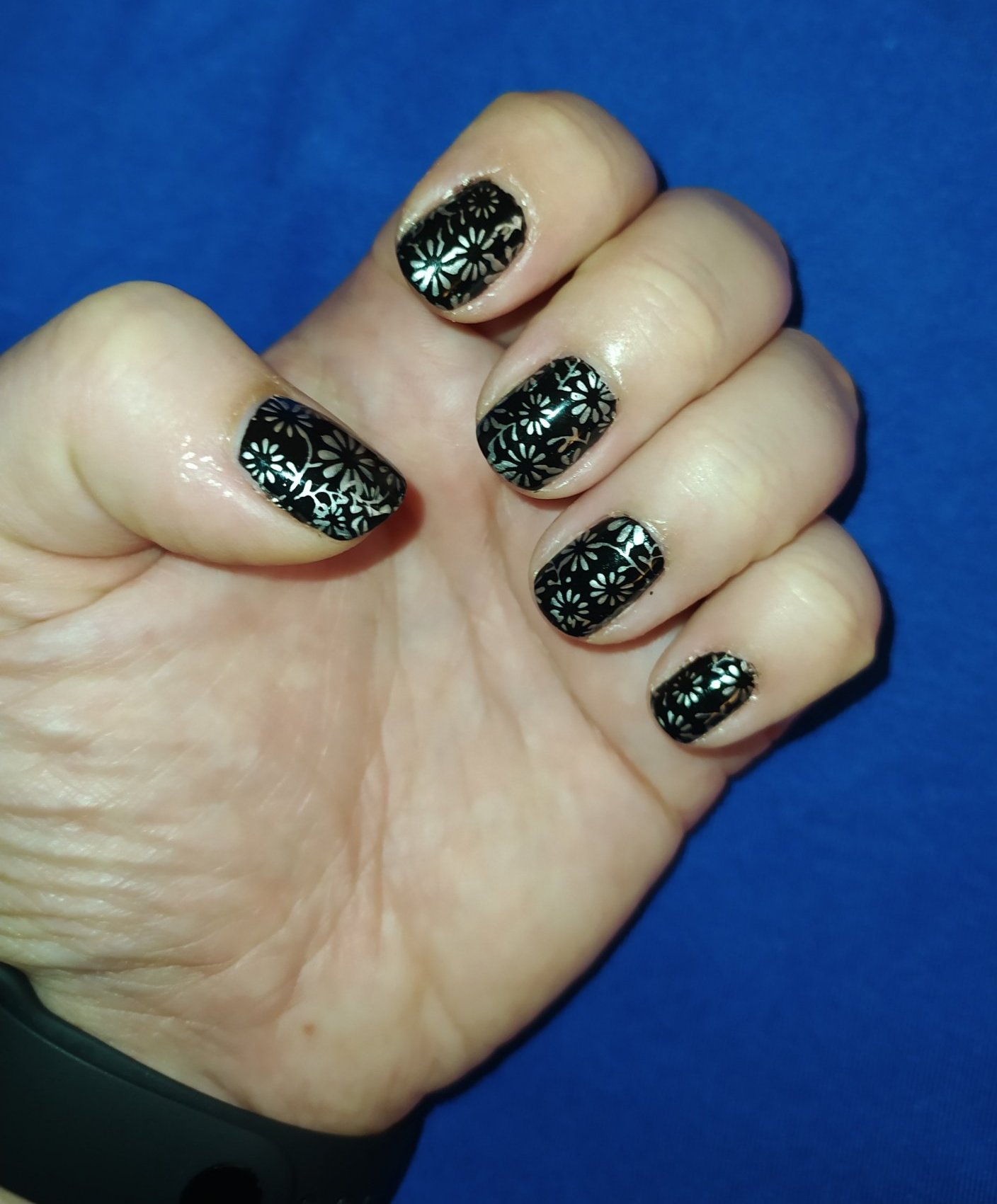 Печатът е с един стар лак GR Color Expert, по-скоро е розов а не сребрист, но на снимките не личи особено. Хубав и покривен е, но рядко го слагам понеже супер бързо се изтрива от връхчетата на ноктите. За печат обаче се оказа страхотен, както вече се е и сгъстил леко че е старичък.
