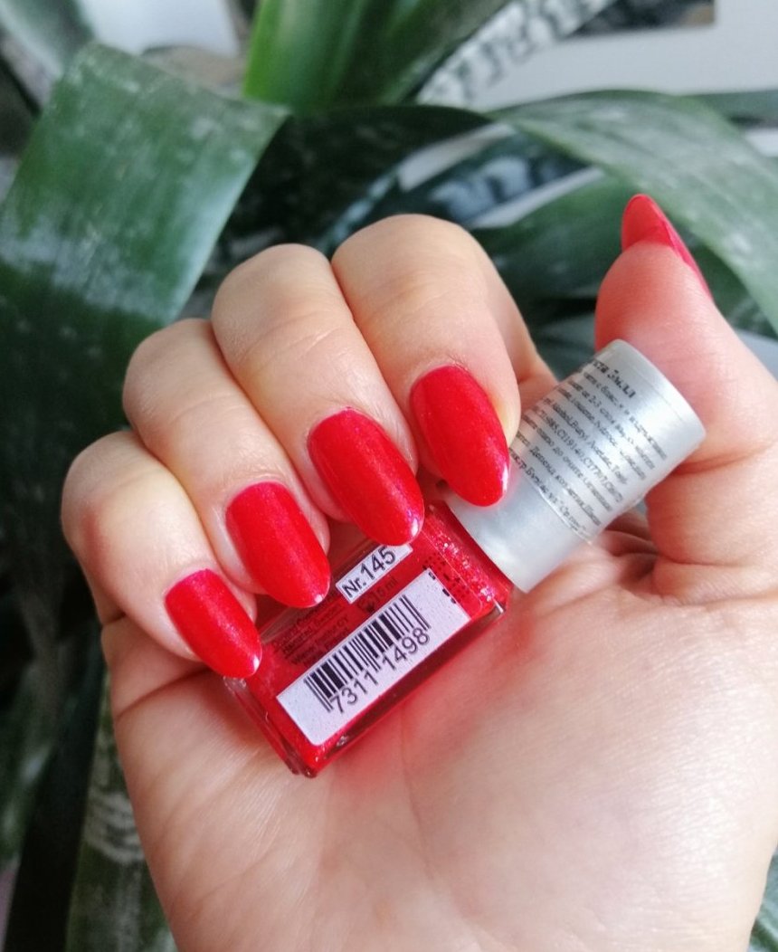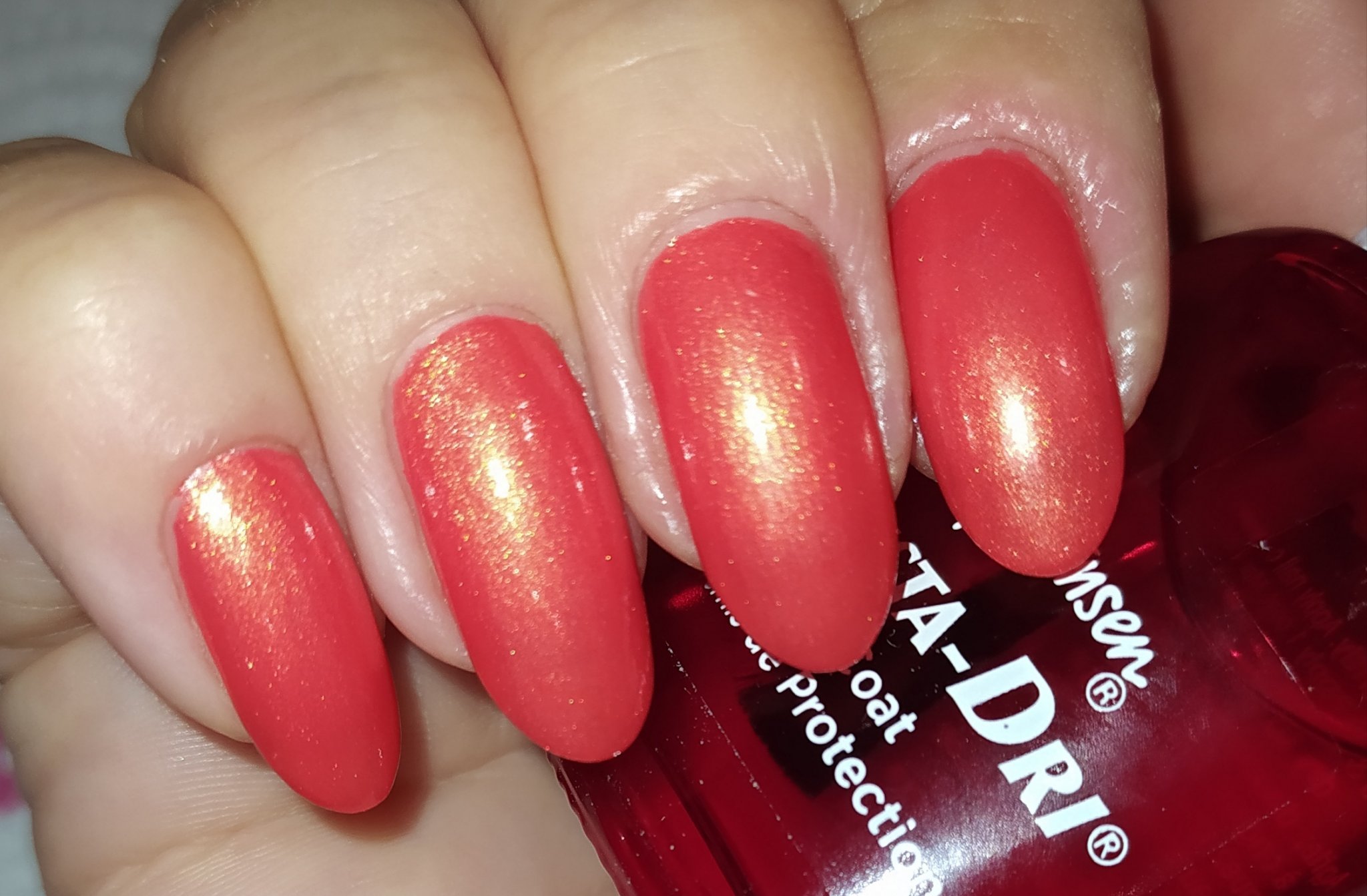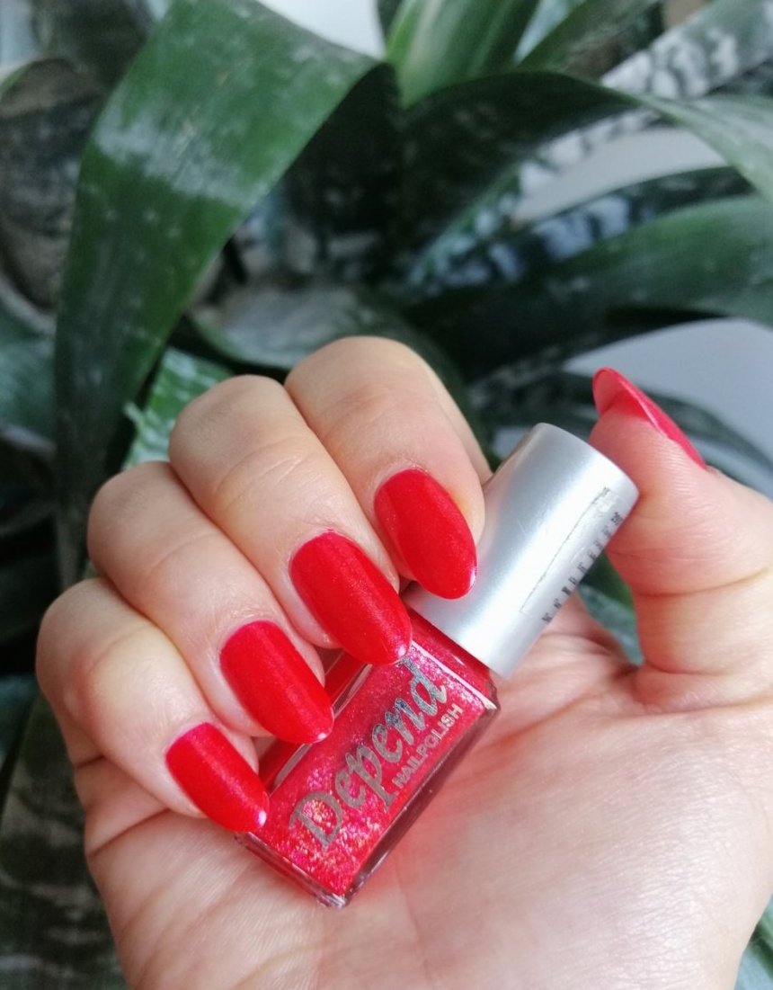 От 4 дни съм с този много красив Depend, който е от преди 10 год. сигурно, но не е мръднал. Понеже ми е останал половин, се наложи да му капна разредител и се лакирах без проблем. Интересен доматен корал е с мини флейк частички в сребристо, прасковено и розово. Има дълбочина и на 2 слоя ноктите са като желирани. Не покрива напълно, но и не е типичното желе. Без топ лак също си е блестящ, но за шимърите знаете е задължителен.