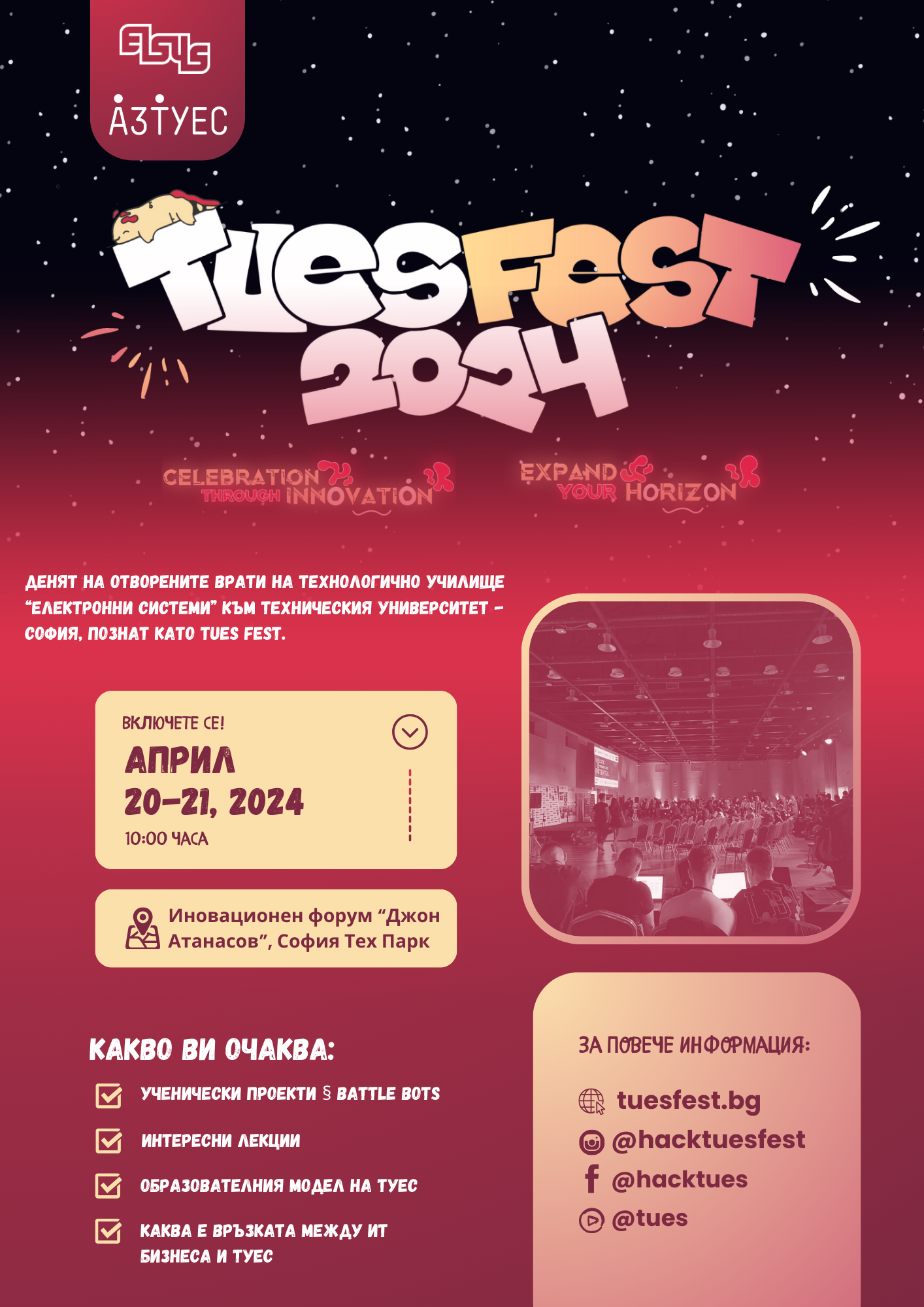 TUES Fest е денят на отворените врати на Технологично училище „Електронни системи“ (ТУЕС) към Технически университет – София. Второто мащабно събитие на ТУЕС, където талантливите възпитаници на училището могат да представят свои разработки, дипломни/курсови работи и проектите от Hack TUES  пред ученици, бъдещите туесари, ИТ индустрията и други! Посетителите могат  да се запознаят с ТУЕС към ТУ-София отблизо и с това какво прави различно училището: