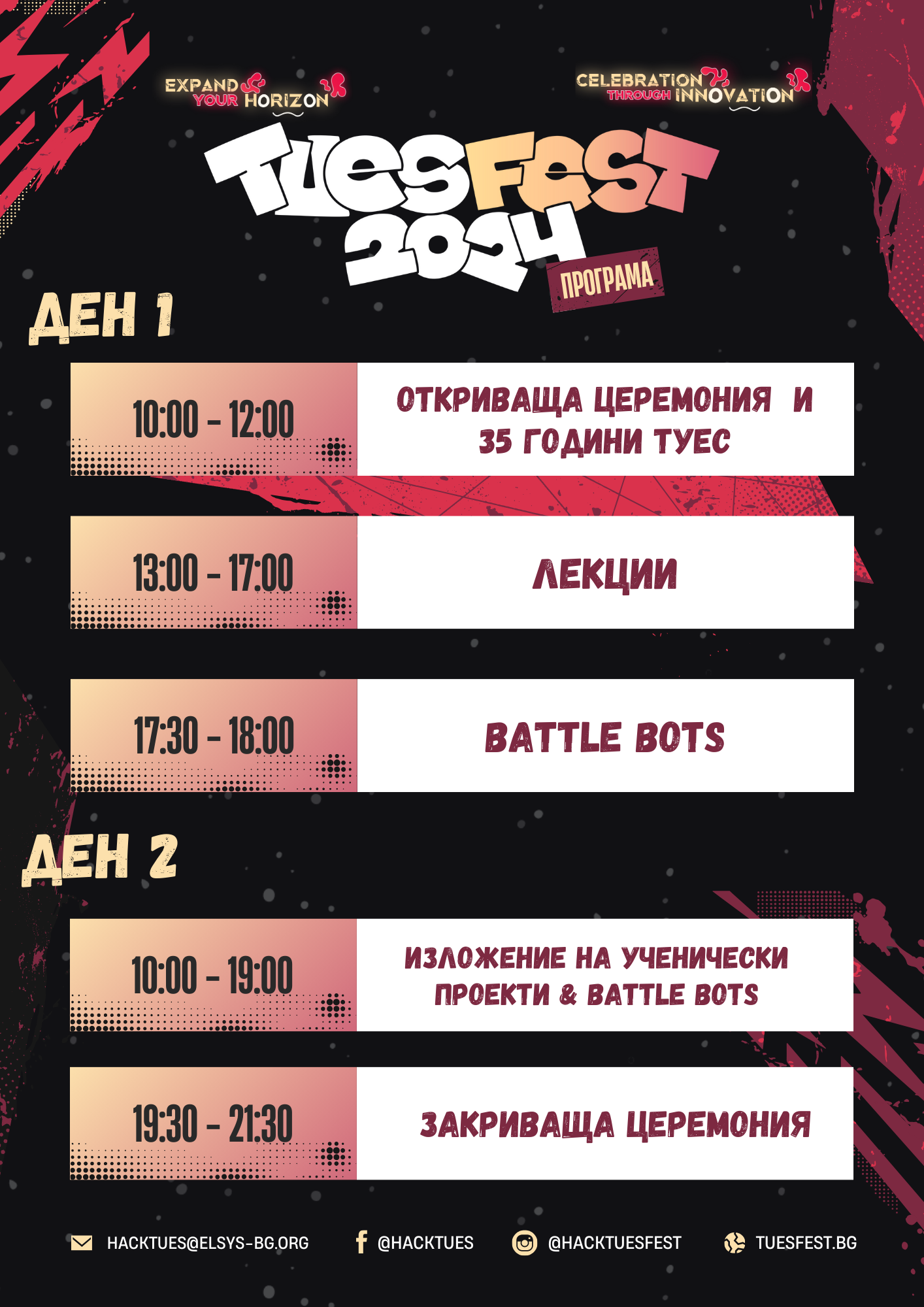 TUES Fest 2024 за пръв път ще се проведе в цели два дни присъствено, а именно на 20-ти и 21-ви април в Иновационен Форум “Джон Атанасов”, София Тех Парк. В началото на първия ден ще отбележим символично 35-тата годишнина от създаването на ТУЕС. След това, програмата за 20.04 включва кратки лекции със завършили ТУЕС-ари с теми за училището, след училищното развитие и най-новите технологични иновации в ИТ сферата. Следва полуфинала на очакваните с нетърпение Battle Bots и денят ще завърши с представянето на проектите на учениците от 8-ми до 12-ти клас.
