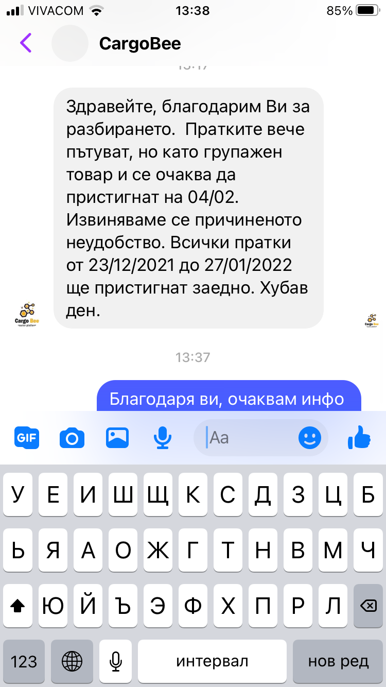 Току-що говорих с Cargobee - пратките вече са в Бургас. На този етап няма яснота дали и кога ще възобновят доставките от Англия.