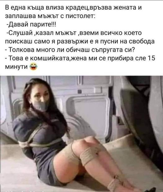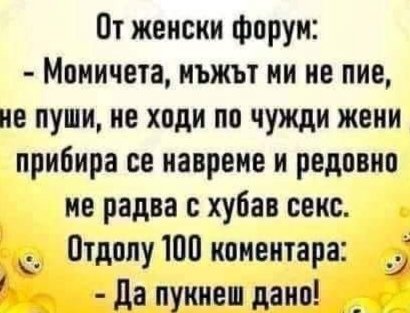- Добре съм, миличък, сготвих супа, опекох пържолки, измих прозорците, подредих стаята на децата, сега си седя тука и шия гоблен. Обаче ако и утре не платиш интернета, ЩЕ ТЕ ИЗКОРМЯ!