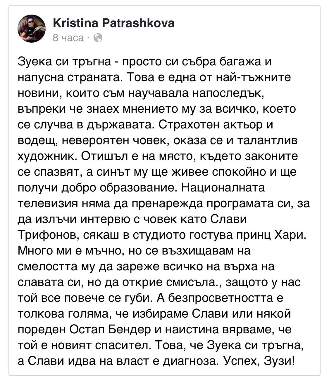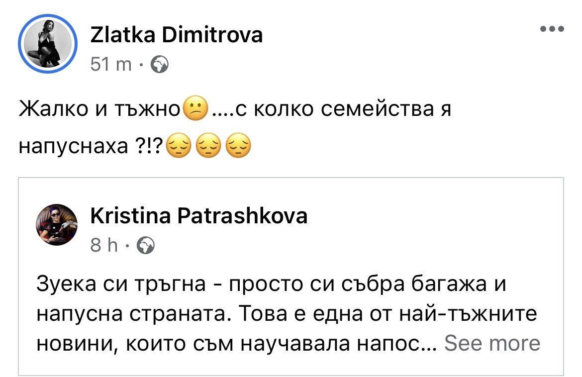 Оплакват Зуека, все едно е умрял. WTF бе? Всеки човек решава как да живее живота си, искал да отиде в друга държава, отишъл. Част сме от Европейския съюз, където всеки може да живее и работи в 27 държави  все пак. То едни фейсбук статуси, едно чудо...