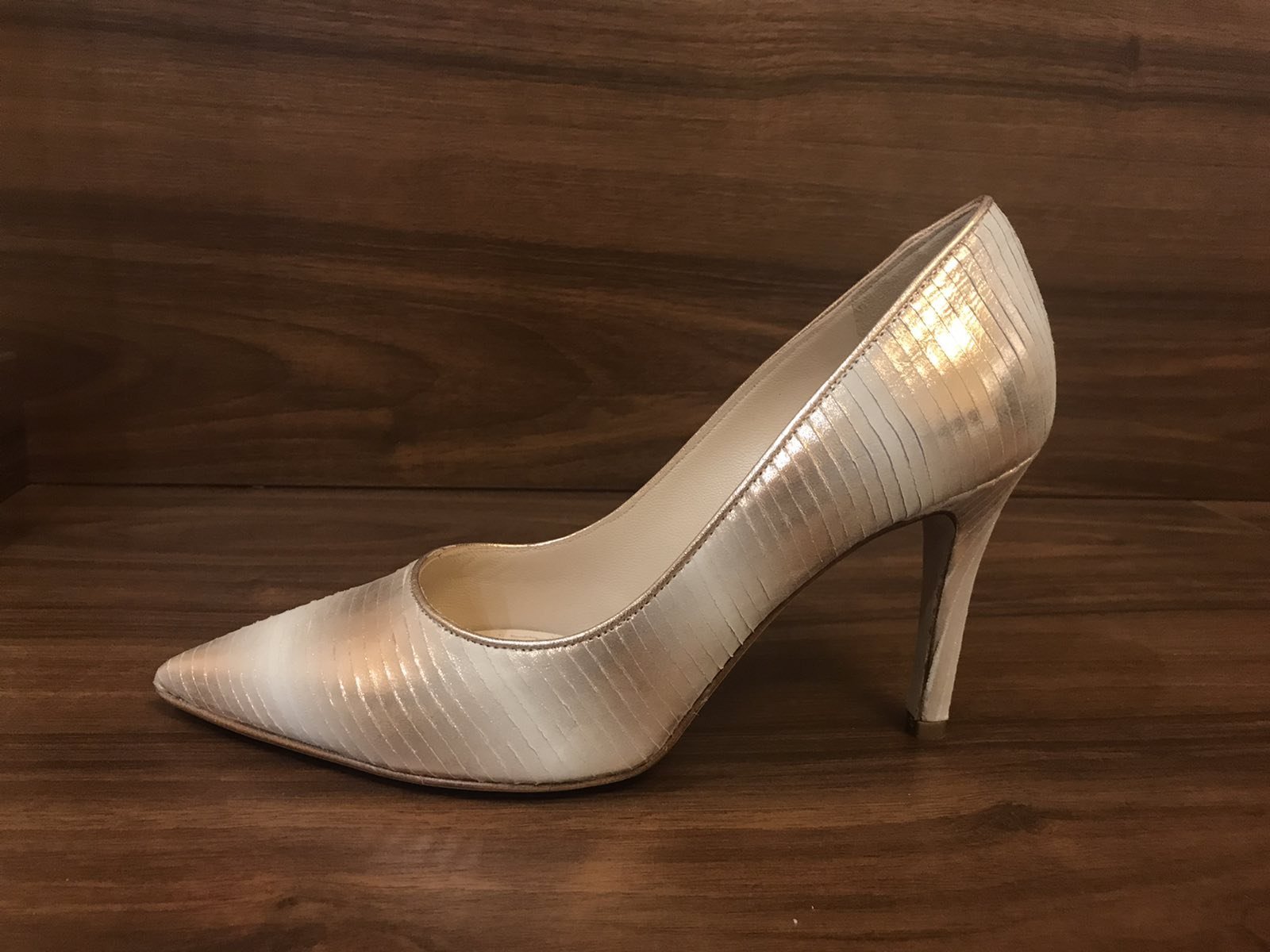 Момичета намерих си жестоки обувки. Първо си харесах едни сандали в цвят "корал", които между другото стояха наистина страхотно, а и веднага маркирах и чанта за тях. И, ако не бях намерила друго, щях да ги взема. Обаче точно в следващия магазин ги видях и край - това бяха обувките. Направо ми лепнаха на крака. Стоят жестоко на тъмно синьо - бях си обула панталон в цвета на роклята и гледах дали ще си отиват с него. Перфектно паснаха. Качвам снимки, но цвета не се вижда толкова хубаво, колкото е на живо. Цветът е златен меланж между бяло и розово злато, които преливат един в друг /по-светлото, което се вижда на снимките е цвят бяло злато, а по-тъмното - розово злато/. Ох, нещо не мога да го обясня, както трябва