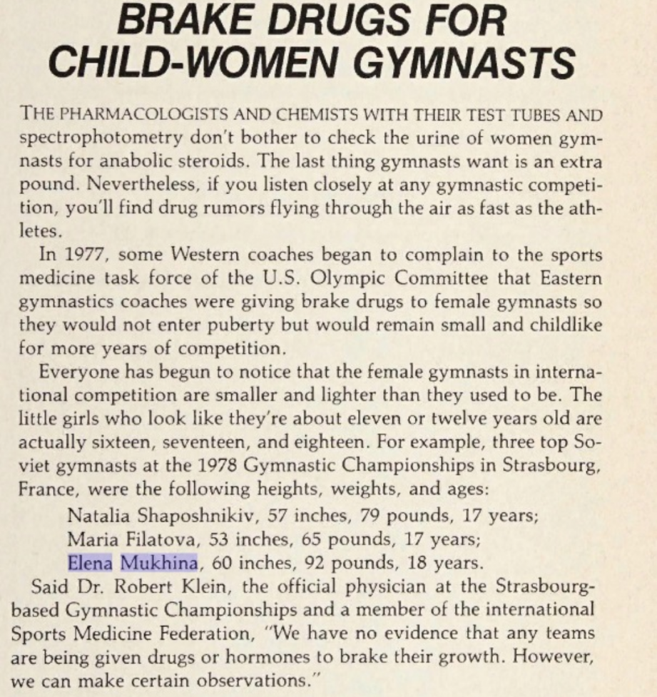 '''- Драги слушатели сензацията в палата на Минск несъмнено бе 15 годишната Елена Мухина. Кое е това момиче се питат всички? Елена само от година и половина тренира в клуб СЦКА Москва. По това време треньорът Михаил Клименко я взима в групата си, до този момент той никога не е тренирал момичета, само момчета. Клименко обаче доказа, че за кратко може да извая истински шедьовър с това тихо и крехко на пръв поглед момиче. Мухина изненада всички със сложните си комбинации на всички апарати. Тя определено бе изненадата в Минск''
