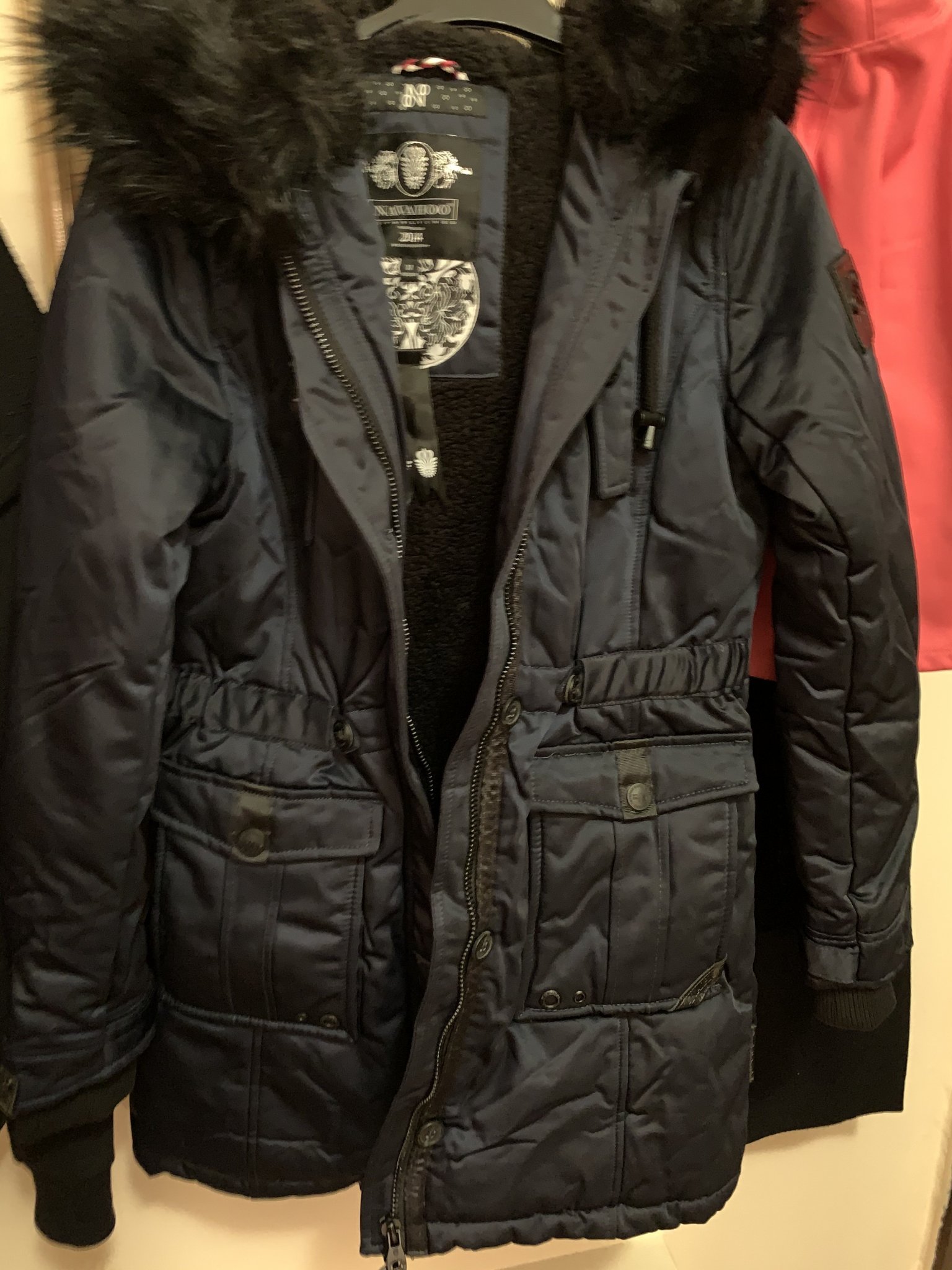Аз чакам моето само, че синьо и е малко по-дълго. Единствено качулката и по-точно пуха не ме кефи, но може да се махне отделно. Да знаете, че има някаква лъскавина на плата.