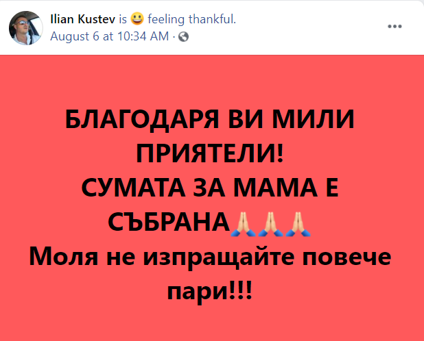 Остава да пожелаем успешна операция на майката на Илиан Кустев. Сумата вече е събрана.