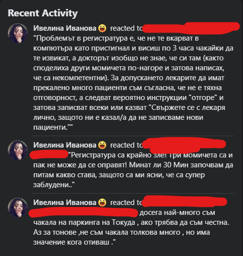 Има може би една или две други, които наистина си вършат работата и се държат добре. А тези двете като почнат да вилнеят по групите (ако искат и тук да заповядат), като отиде на преглед някоя жена, която е писала критичен коментар към тях, който е получил хилещо се човече, наистина ли може да очаква, че ще бъде обслужена уважително и без ехидни нагли усмивчици? Защото във ФБ всички застават с името и снимката си, как да съм сигурна, че утре няма да чакам още повече заради нараненото его на една госпожица, която дори не си върши работата като хората?