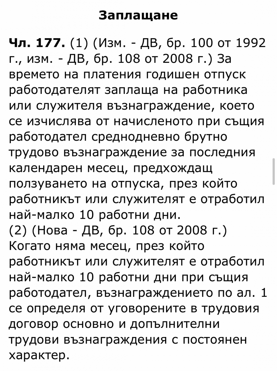 Чл. 177. (1) (Изм. - ДВ, бр. 100 от 1992 г., изм. - ДВ, бр. 108 от 2008 г.) За времето на платения годишен отпуск работодателят заплаща на работника или служителя възнаграждение, което се изчислява от начисленото при същия работодател среднодневно брутно трудово възнаграждение за последния календарен месец, предхождащ ползуването на отпуска, през който работникът или служителят е отработил най-малко 10 работни дни.