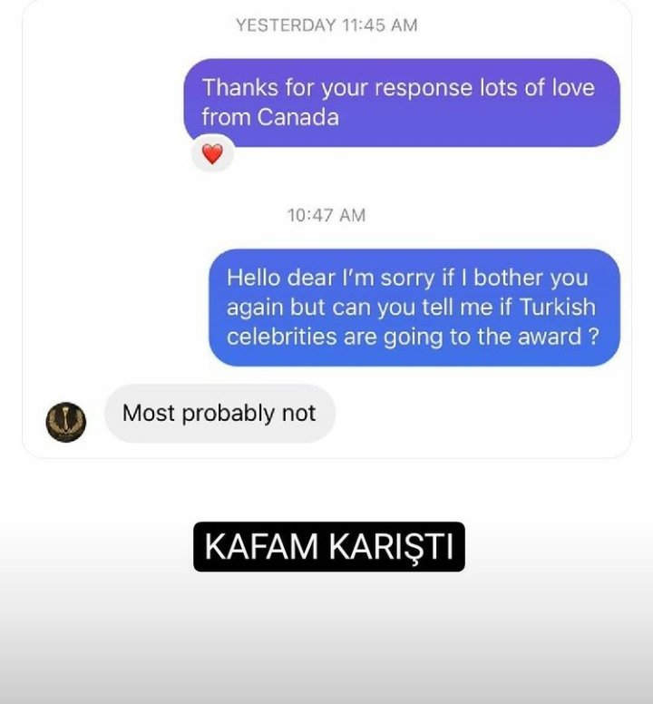 Фен е писал на Murex d'Or в инстаграм с въпрос дали на церемонията по награждаването ще присъстват известни личности от Турция. Отговорили са, че най-вероятно не.🥺Нали уж бяхме спечелили?!😔