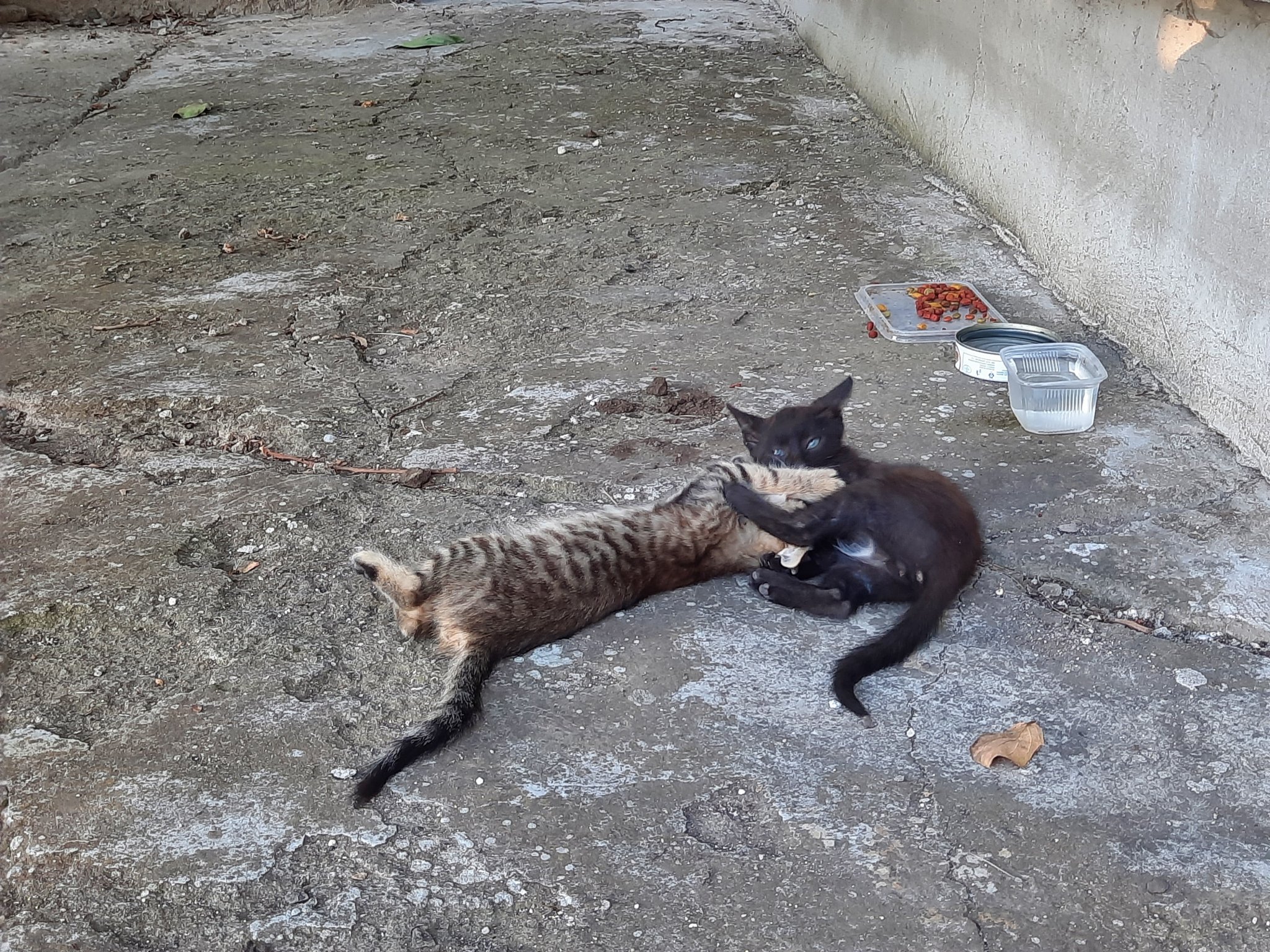 Ами да, аз самата очаквах да изяде един наръч бой, щото тия не напразно съм ги кръстила тримата хаймани. Обаче те само го потупват, както казваш ти, с меки лапки, и си играят с него.