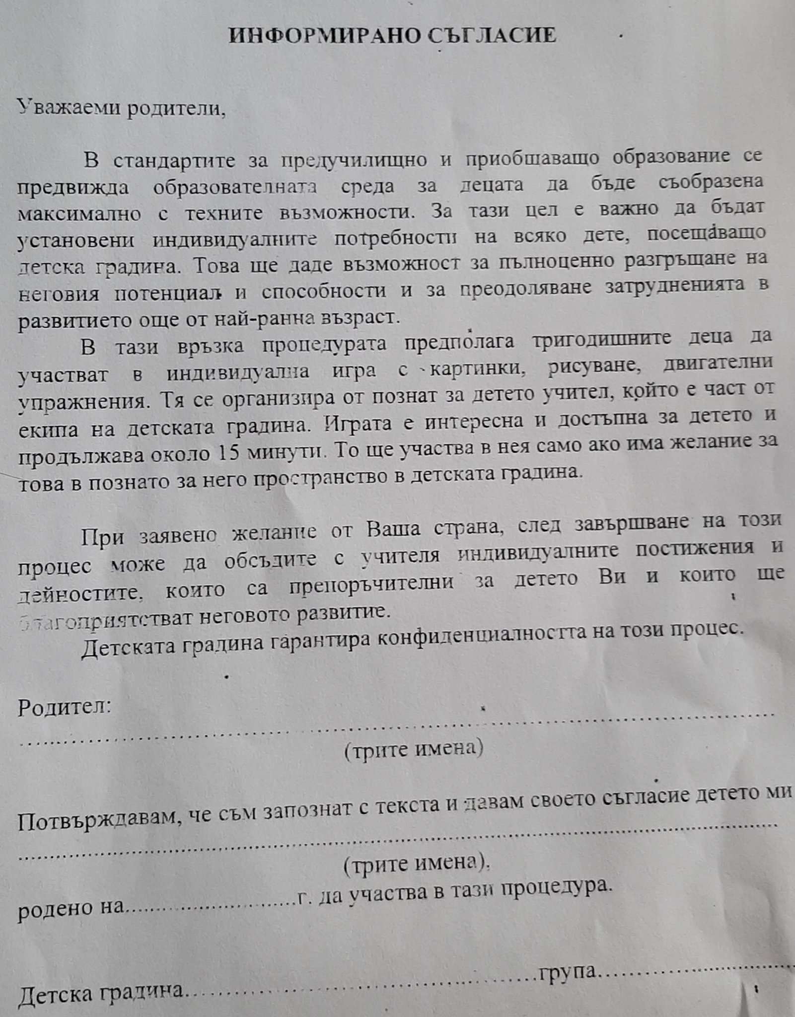 Coco, и аз наскоро попълвах такава декларация за съгласие. Даже учителката показа какво представлява, нещо като книжка с две страни и  им задават въпросчета, а те трябва да посочат правилната картинка.