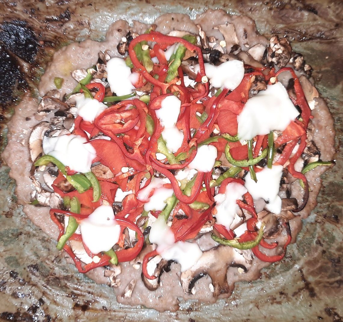 А, "рецептата" е много лесна 😃 За "блата" сплесках 3 кюфтета (щях да слагам яйце, подправки, но се прибрах гладна и бързах- цял ден бях на фаст), отгоре наредих зелена и червена чушка на тънки ивици, кралски печурки (такива гъби имах) и полях с малко зехтин. Като се запече малко, добавих отгоре кашкавал. Докато се разтопи нарязах малко пушен бекон на филийки, жълти и оранжеви домати и ги добавих върху вече извадената пица, ръснах и рукола отгоре. Жълти и оранжеви домати купувам за първи път😅, бяха намалени в Лидъл и реших да взема за цвят (жълтите ми харесват повече, киселеят приятно). Руколата беше изостанала в хладилника. На мен ми хареса много на вкус, само ако имах и маслинки..."разточих" каймата на тънък пласт. Снимки: