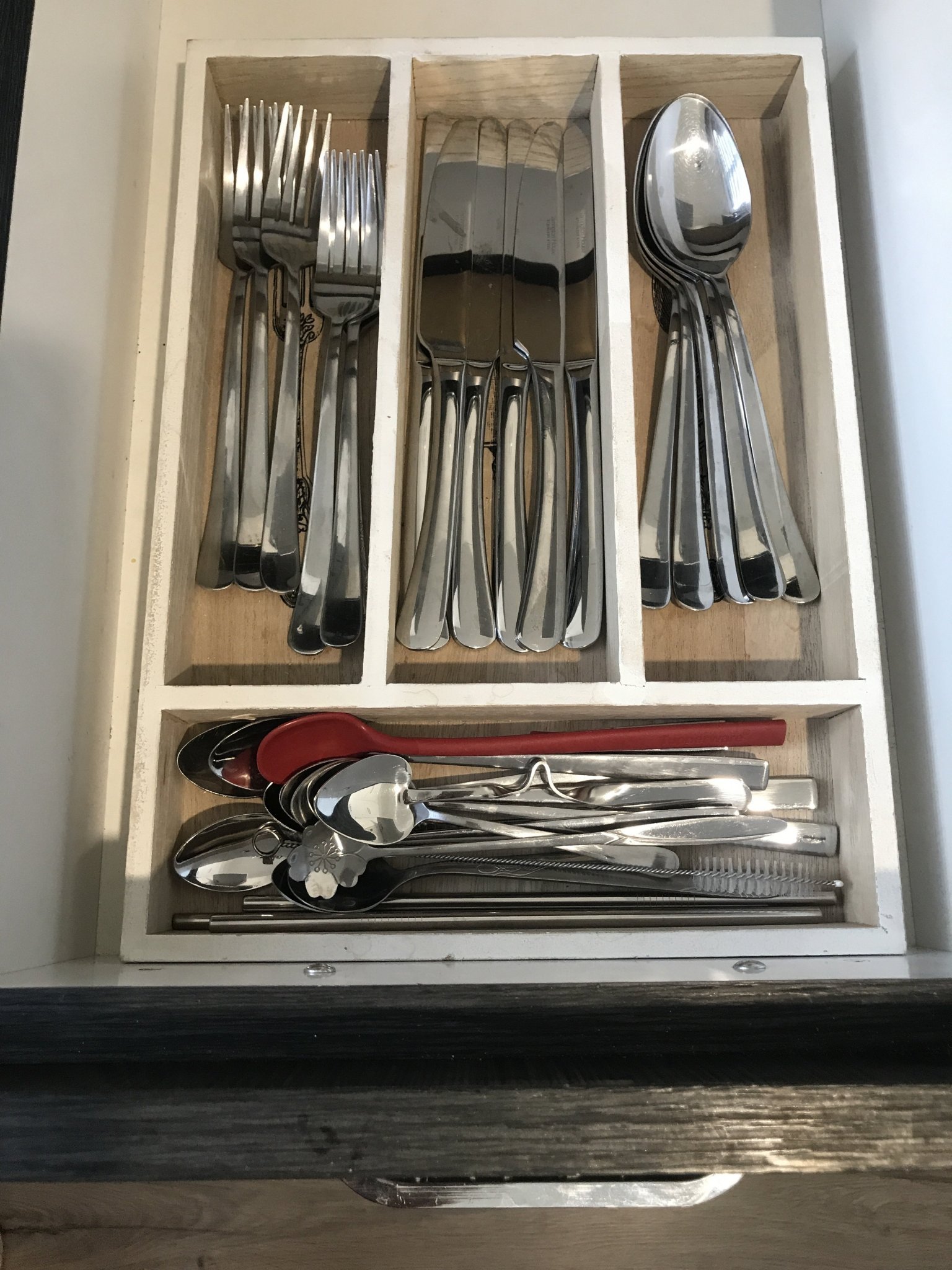 Много са удобни тези органайзери за приборите, моят също е подобен. При мен има и още една преграда отстрани която е от горе до долу и в нея слагам големи ножове, та съвсем идеално ми идва. На майтап го купих отнякъде като временно решение, а си остана с години вече.