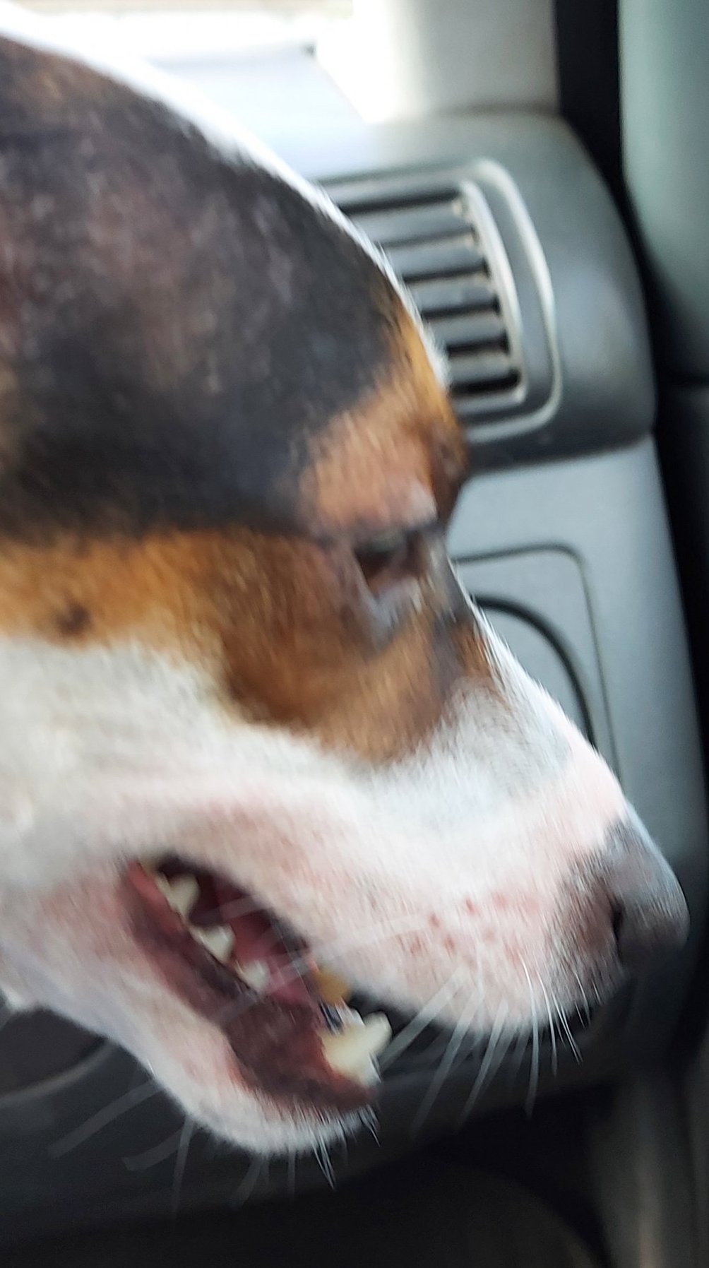Лежа си мирно на дивана и като я обзе лудостта да се търкаля на ляво-гръб-дясно...че като се разхълца,сви уши,отиде и легна до вратата и си изяде пелената. Изведох я вън да върши нещо,тя пасе милата вече 10мин и само уригва и пак пасе.