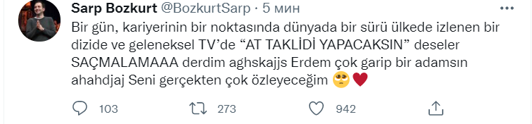 "Ако един ден, в даден момент от кариерата си, те биха казали в телевизионен сериал, който се гледаше в много страни по света и по традиционната телевизия, „ЩЕ СИ ПРЕДСТАВИШ КОН“, бих казал, че това са глупости, aghskajjs Erdem, ти са много странен човек ahahdjaj ще ми липсваш толкова много"