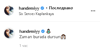 Керем и Ханде рекламират хотела, в който са отседнали. А Ханде е написала в сторито си: "Нека времето спре тук".