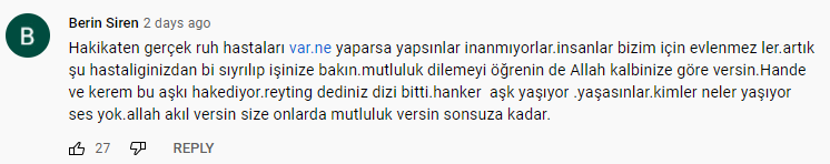 Наистина има истински психични пациенти. Те не вярват в каквото и да е. Хората не се женят за нас. Сега се отървете от болестта си и се занимавайте с бизнеса си. Научете се да желаете щастие, за да може Бог да го даде на сърцето ви. Ханде и Керем заслужават тази любов. Казахте, че рейтингът е приключил. Ханкер са влюбени. Да живее. Кой какво преживява? Няма глас. Нека Бог ви даде мъдрост и щастие в тях завинаги.