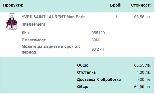 Много ми хареса, как се получи цената на този парфюм, който отдавна наблюдавам и съм намислила за придобиване от известно време. Поръчах с вземане от магазина: