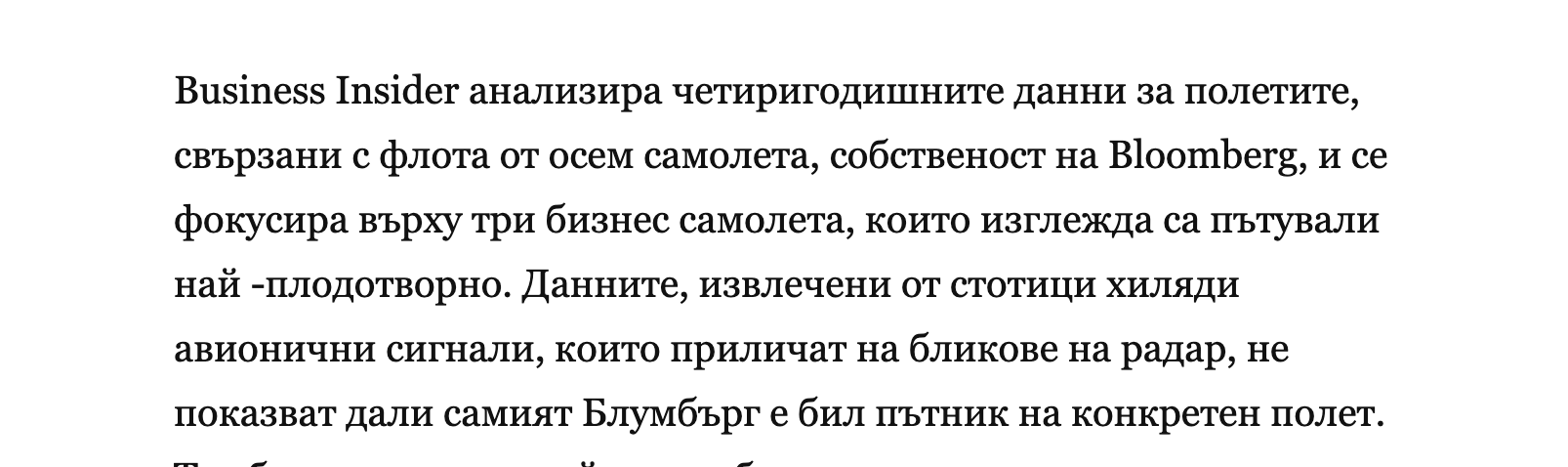 В статията пише, че няма доказателства Блумбърг да е бил пътник на който и да е от анализираните полети. Корпорацията му притежава флота от 8 самолета, в статията пише, че се ползват от няколко компании.